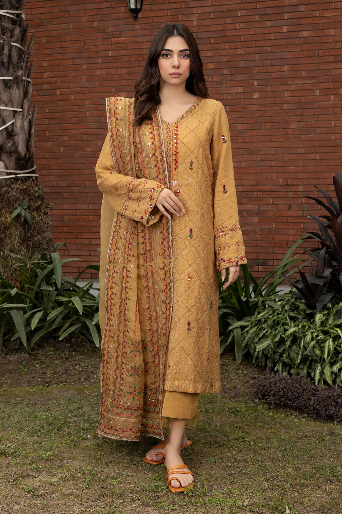 A vibrant mustard cotton Khaadi fabric is embellished with stunning embroidery on the front and...