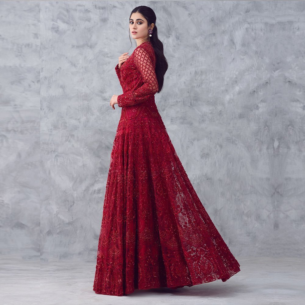 A rich scarlet hued full-length gown with a voluminous flair, hand-embellished with deep red glinting...