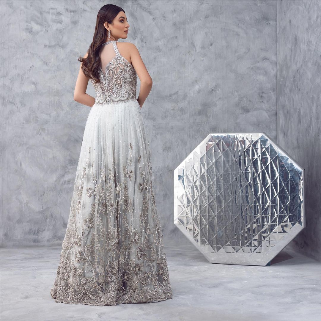 A sleek cut that narrates modernity and refinement. A delicate tapestry of diamantés, pearls, and...