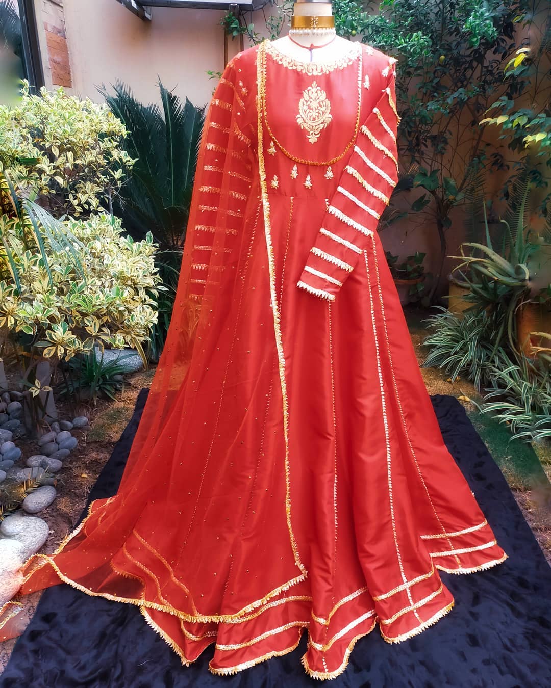 Color: Red Fabric: Korean silk peshwas and net dupatta Work Technique: Tilla & gotti work on peshwas Description: Mukesh...