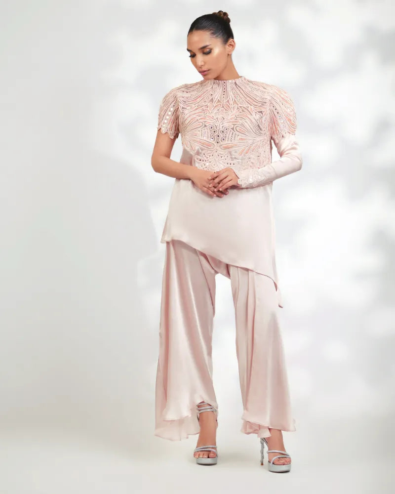 Description: Embroidered and hand embellished front open shirt (appliqued neckline ,sleeves, and shirt panels) Paired...