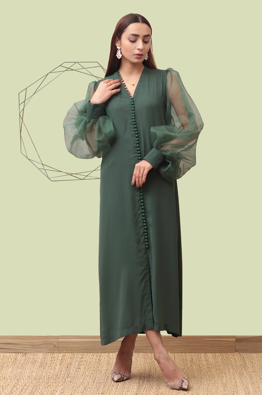 A very elegantly stitched georgette long shirt with pure organza puffed sleeves and cuffs, with...