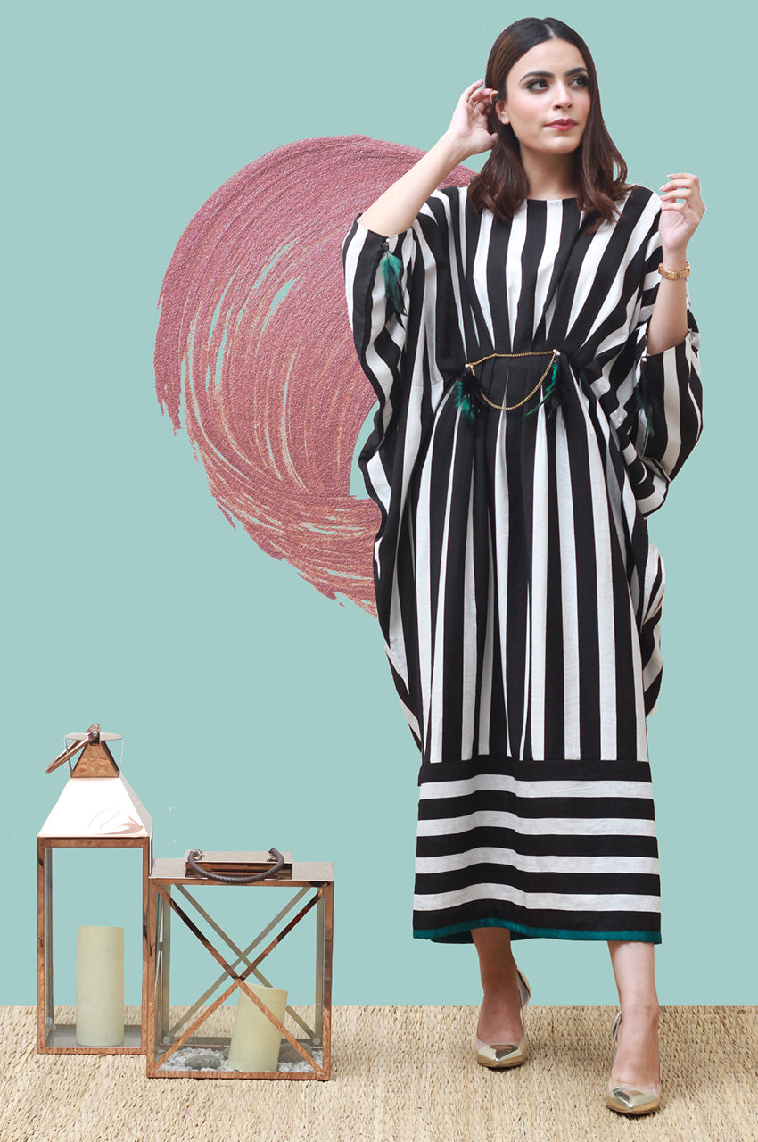 A nicely stitched Irish cotton kaftan with chain and feathers at the sleeves and front