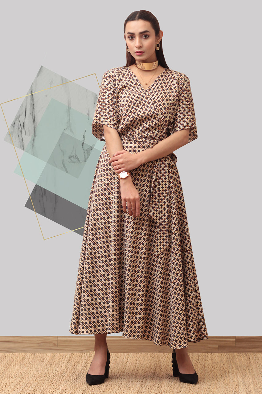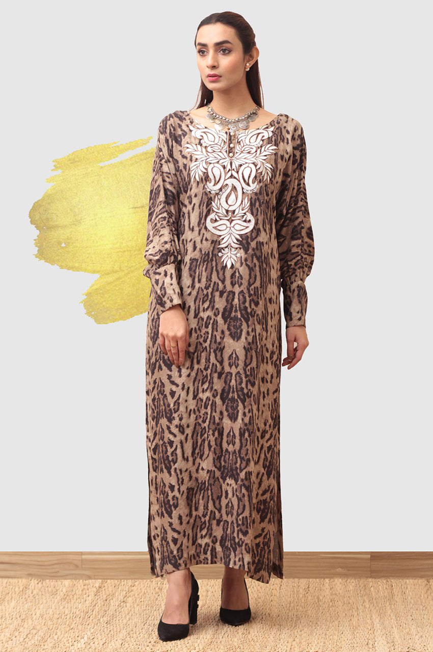 A long printed kaaftaan with handmade nickeline with dori, finished with cuffed sleeves an front...