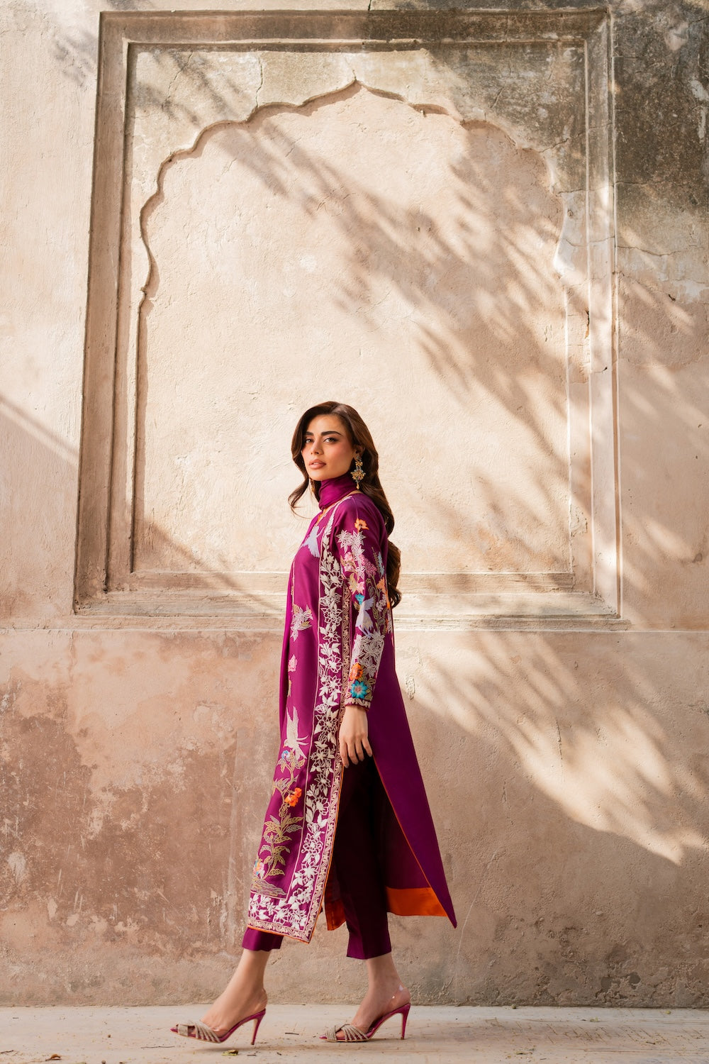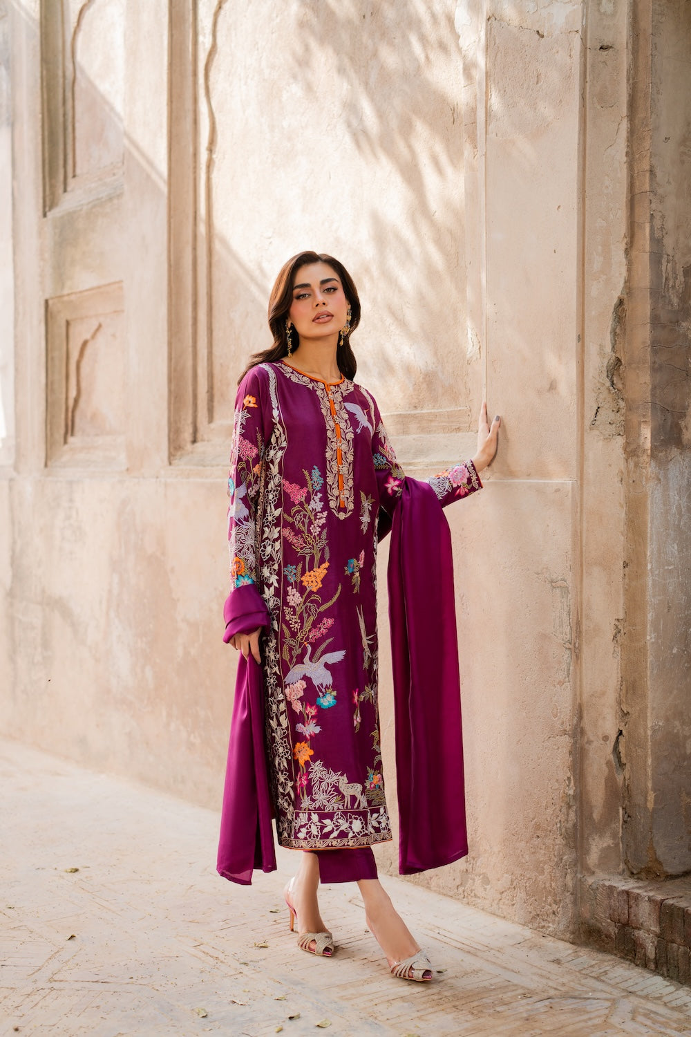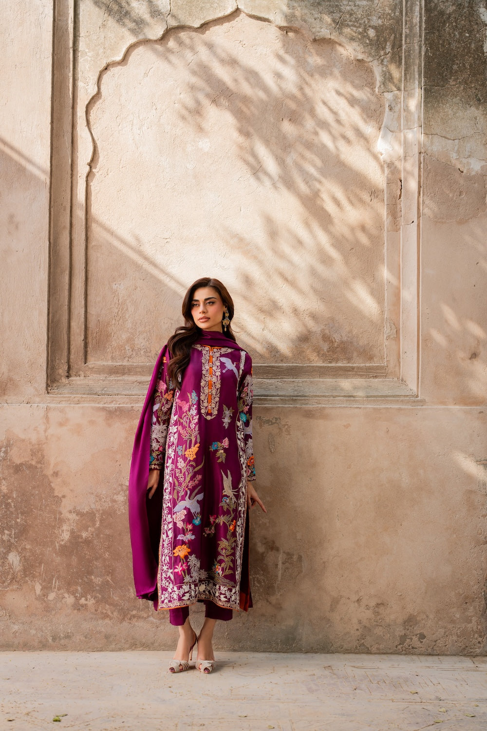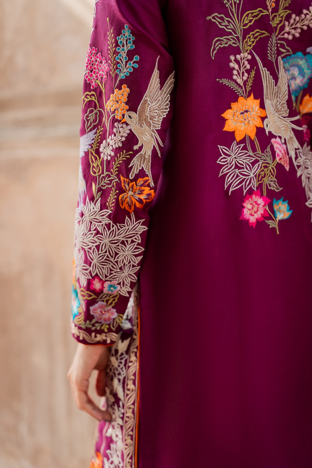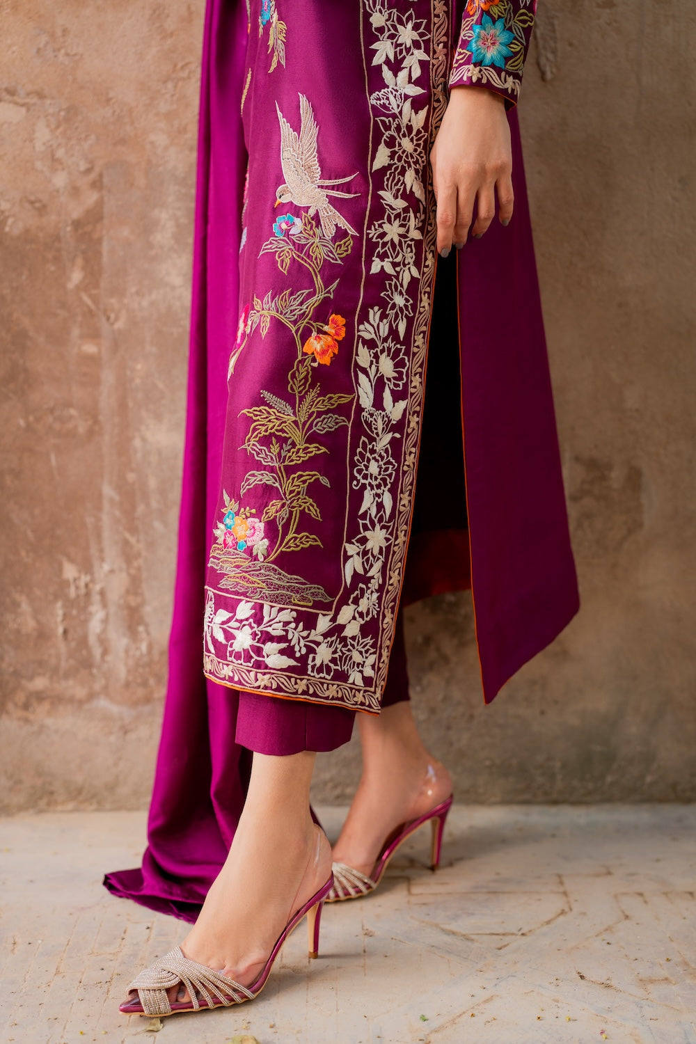 Discover Aafreen, a masterpiece of exquisite elegance adorned with intricate botanical embroidery. Subtle whites and pinks to create a mesmerizing effect, finished with bird and deer embroidery. The fully worked sleeves feature intricate and shimmering birdie details. Crafted from premium quality raw silk, this ensemble radiates glamour and sophistication.