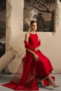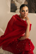 Redefining timeless elegance, Aaria is a captivating expression of chic glamour. Crafted from pure silk in a vivid red hue, the straight shirt makes a bold statement with its exquisite sequin and pearl embellishments. Paired with tailored cigarette pants and an embroidered organza dupatta, this ensemble exudes sophistication, ensuring you stand out at every special celebration.