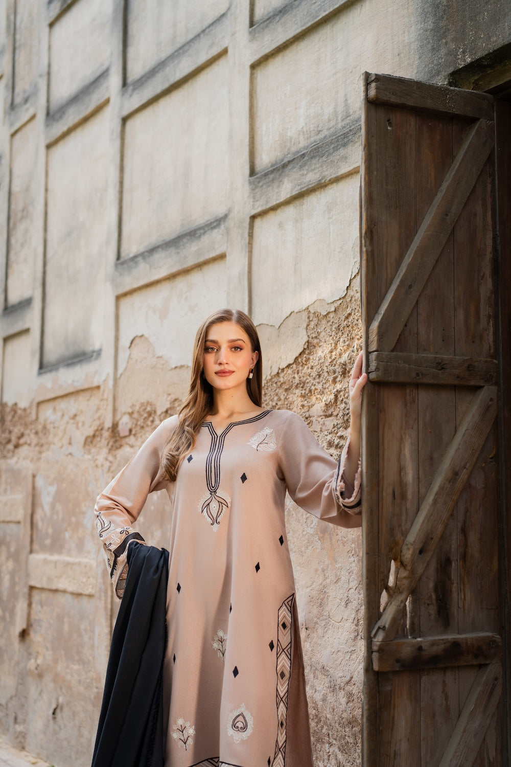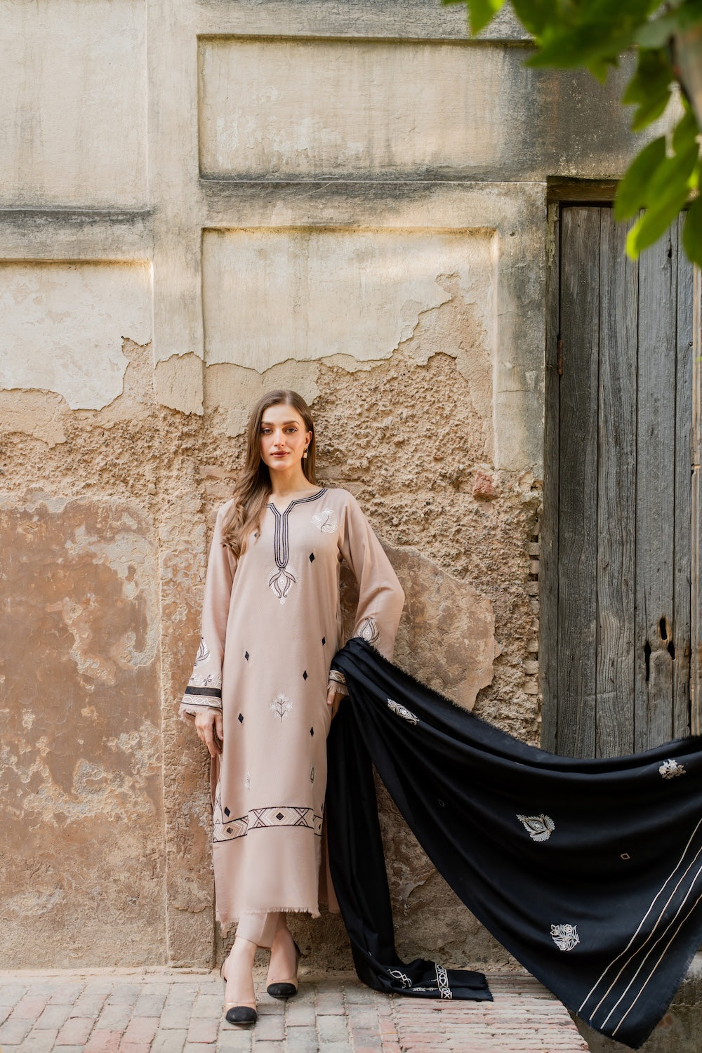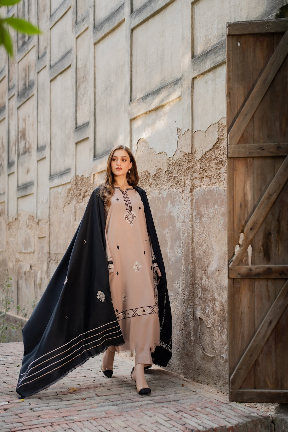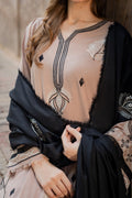 A hand‑worked beige masterpiece, Aayla dazzles with intricate black & white embroidery that defines its motifs and elevates the neckline. Paired with a black karandi shawl, also richly embroidered, it’s the perfect winter‑season statement.