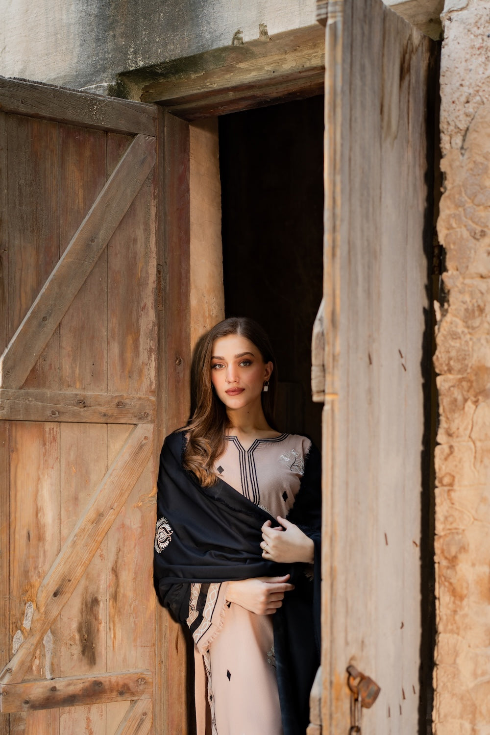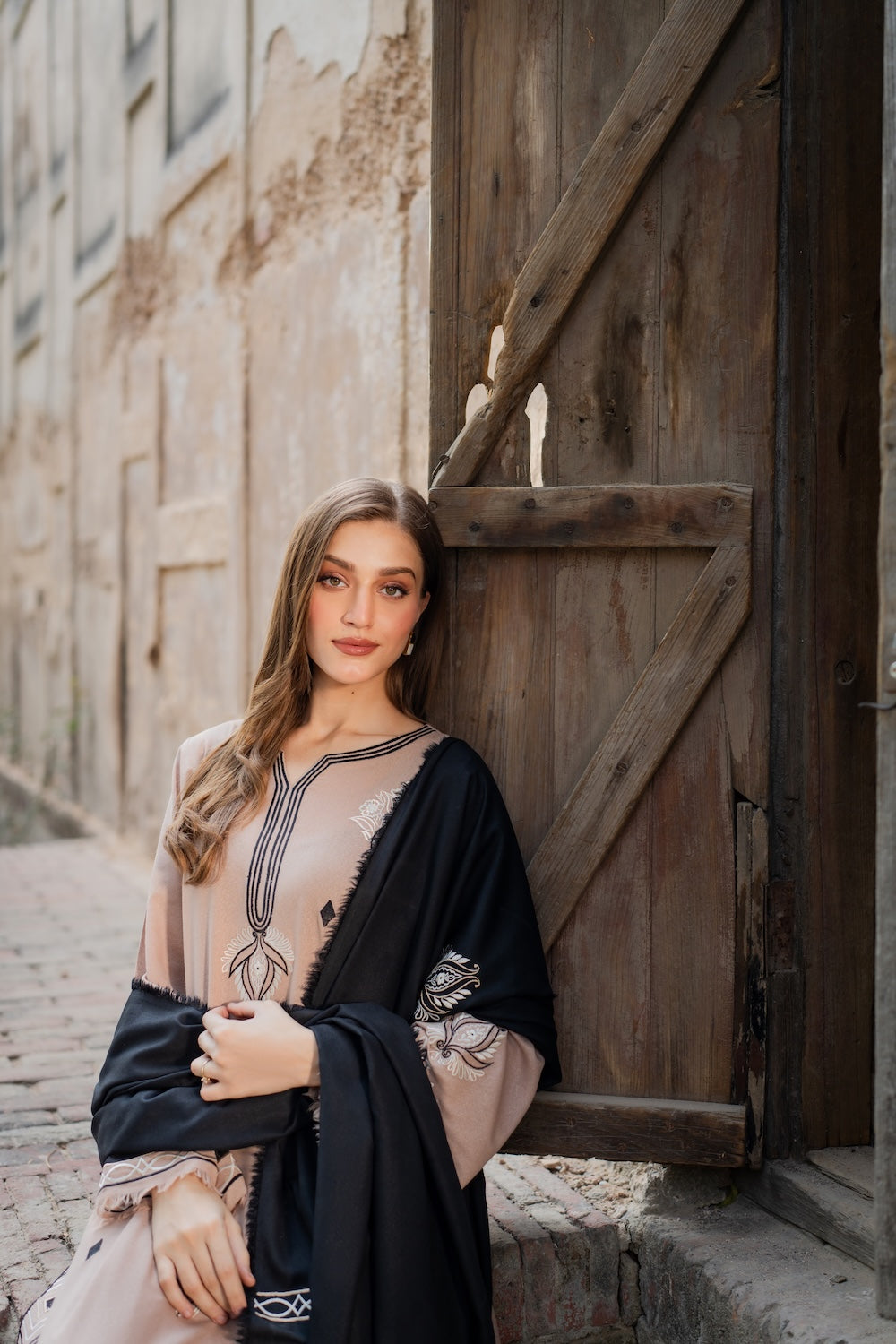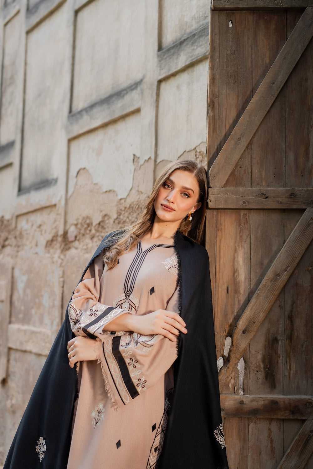 A hand‑worked beige masterpiece, Aayla dazzles with intricate black & white embroidery that defines its motifs and elevates the neckline. Paired with a black karandi shawl, also richly embroidered, it’s the perfect winter‑season statement.