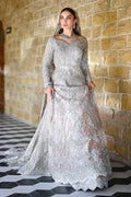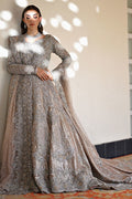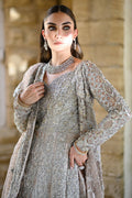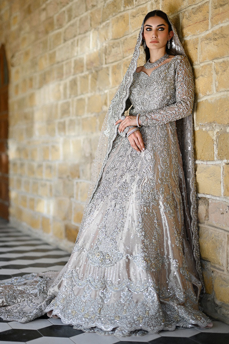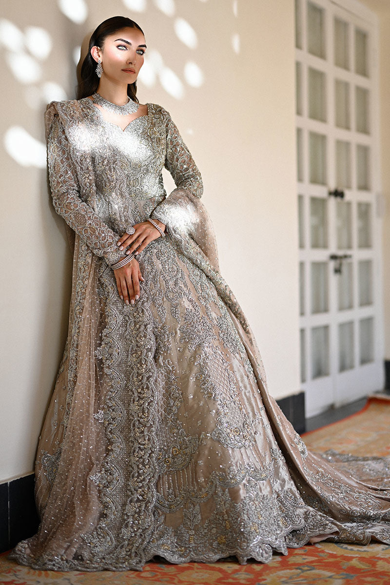 A dusky pink kalidaar crafted from silver lamé, this piece features a sweetheart neckline with a double border detail and long embellished sleeves. The entire kalidaar is richly worked with silver and light gold naqshi and dabka, jaaliwork, and cutwork flowing into a graceful trail. It is paired with a sheesha silk lehenga finished with an embellished border and a net dupatta adorned with heavy chan, four-sided borders, and an extra embellished matha patti.