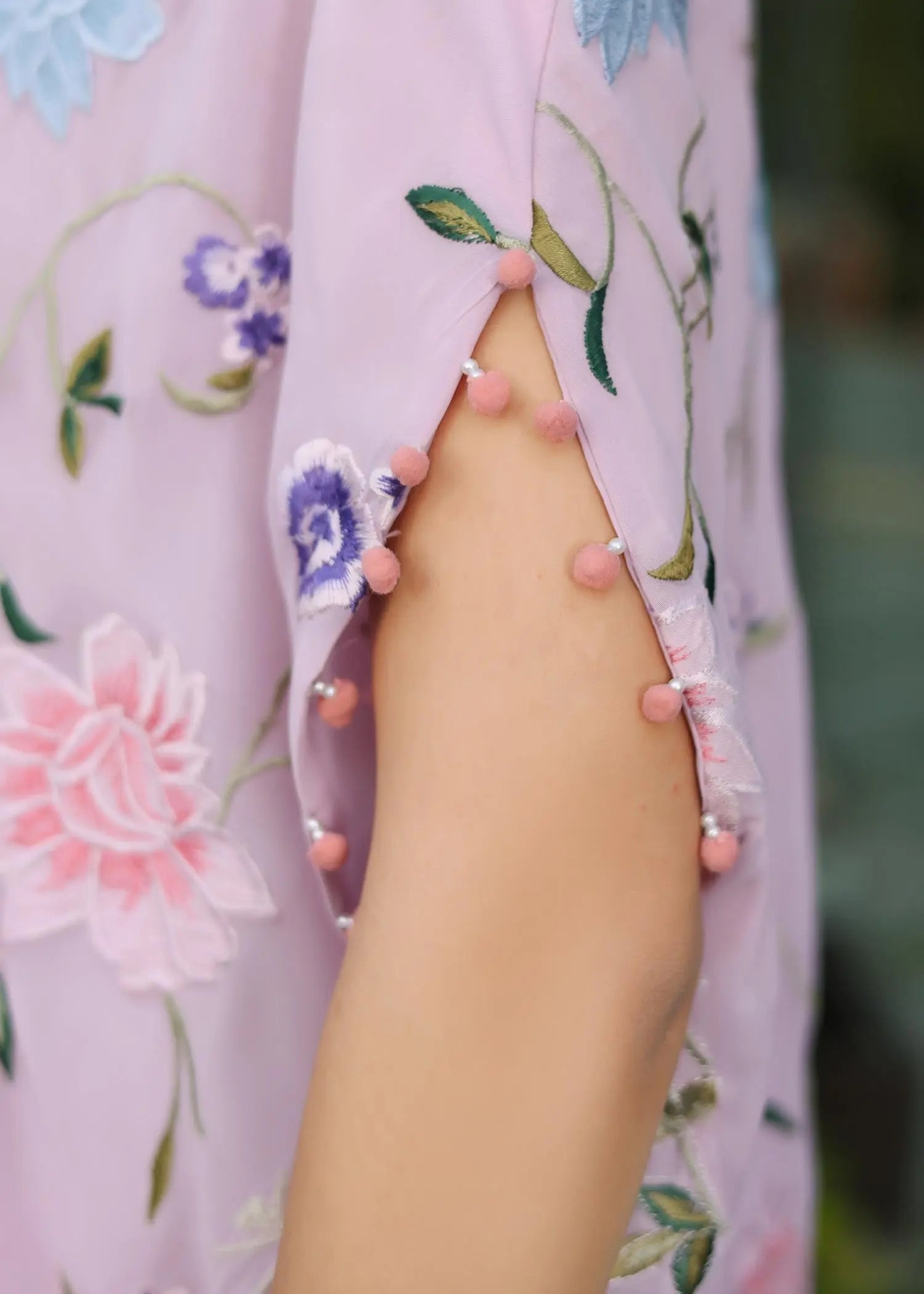 Description: Discover a uniquely crafted piece that guides you through a floral wonderland of vibrant embroidery. Its easygoing silhouette combined with corner-drop capri pants is ideal for any soirée.