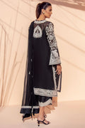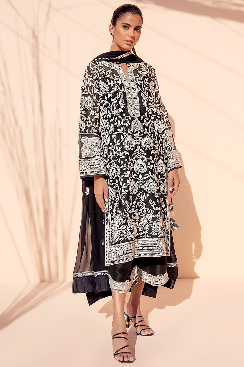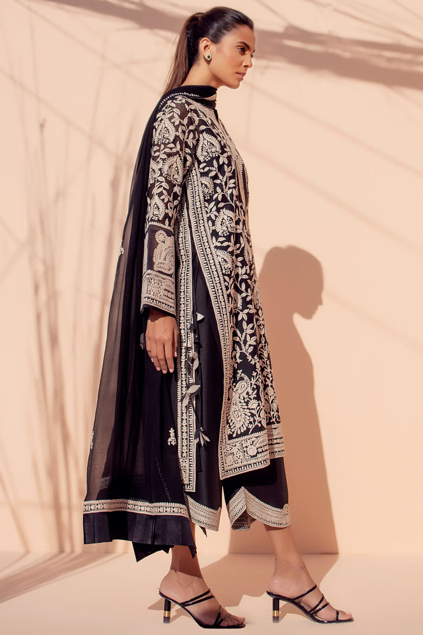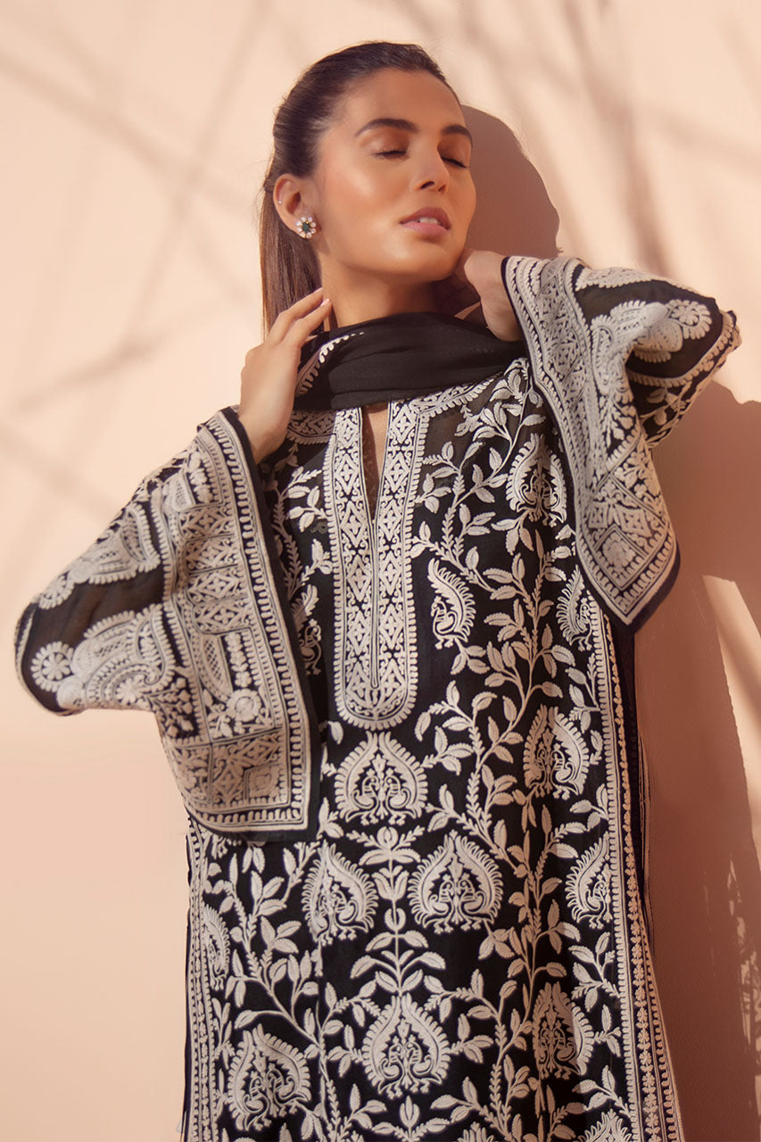 This monochrome organza shirt features delicate Aari embroidery in peacock and foliage imagery. Paired with a chiffon dupatta with embroidered borders and a raw silk izaar that is finished with intricate scalloped embroidery borders.
