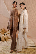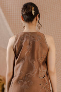 A mocha khaddi silk cord set with a halter neckline paired with a cutwork crew detail, combining contemporary style with intricate craftsmanship. The bootcut pants are adorned with Schiffli embroidery, cutwork, and appliqué work, adding texture and subtle contrast to the sleek silhouette.