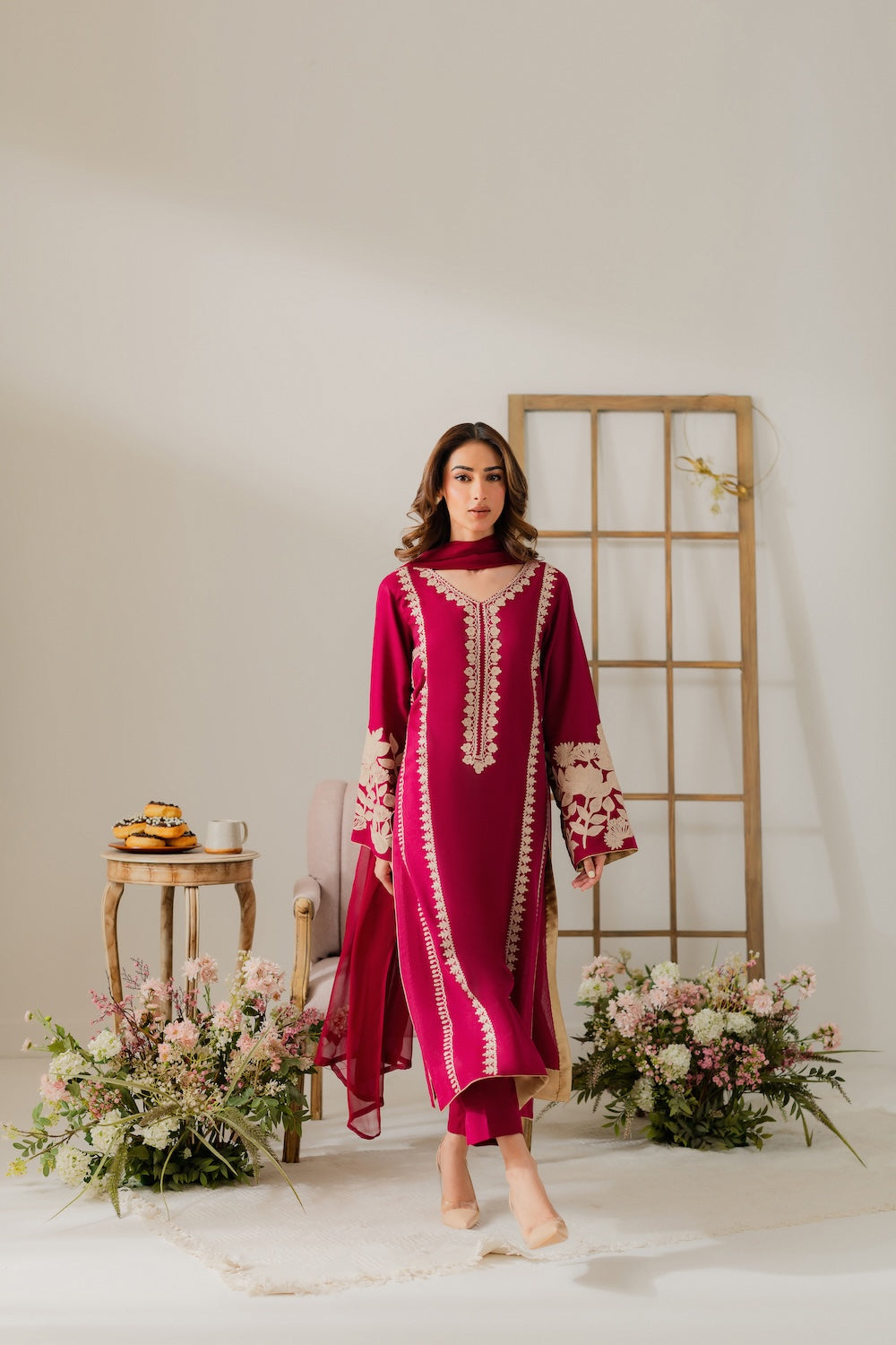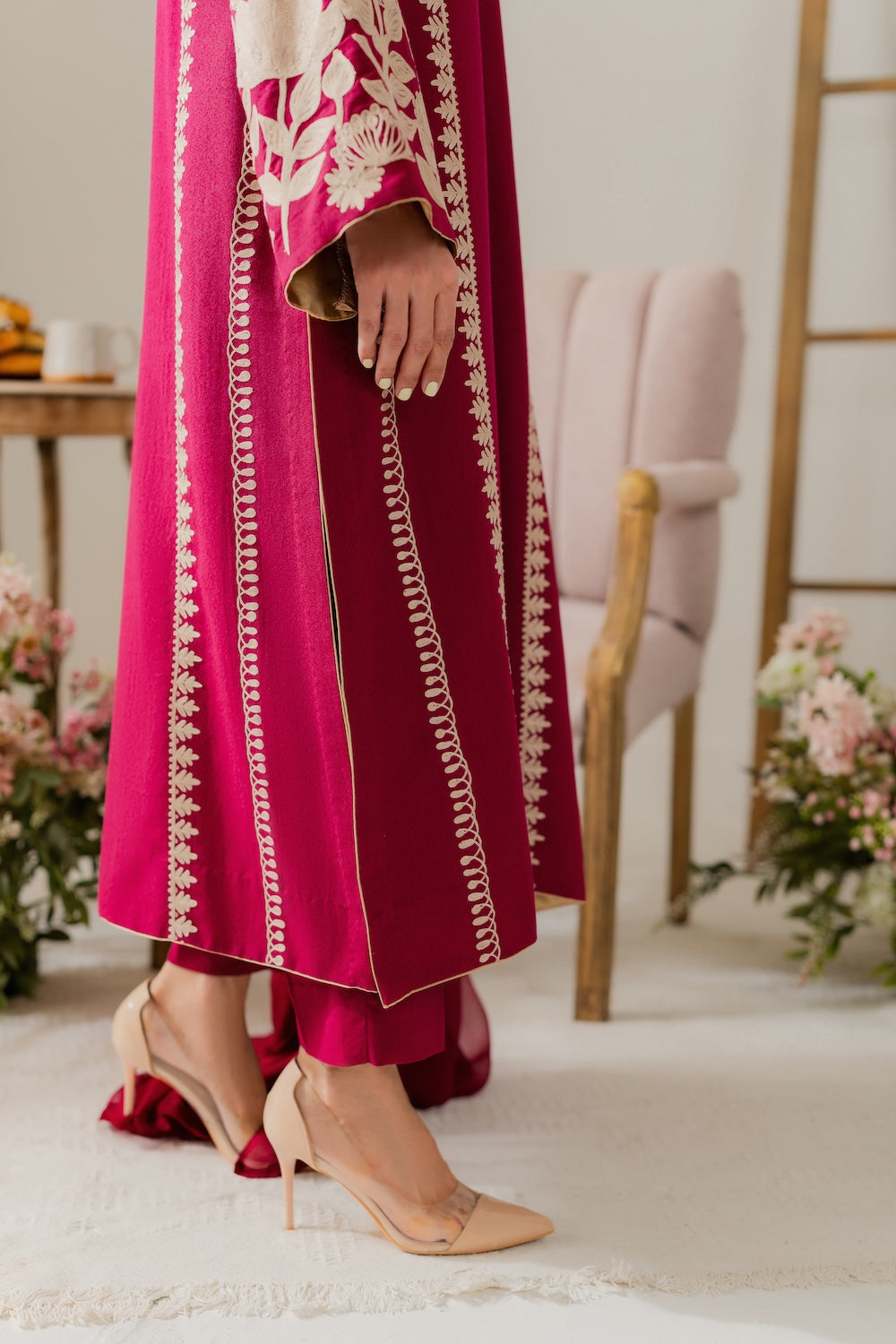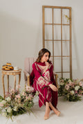 The elegant Alani set is a majenta two-piece that features delicate hand-aari embroidery on front and back with intricate floral motifs. The standout heavy sleeves are richly adorned with shimmering work, adding a regal and formal touch. The vibrant hue and exquisite craftsmanship makes it perfect for your intimate soirees. All in all, this outfit is a beautiful blend of tradition and sophistication. Complete the look with the separately available chiffon dupatta for an added touch of grace.
