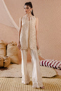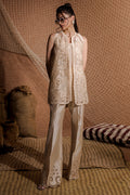 A sheer organza halter jacket with sheesha silk appliqué, layered over a simple crepe slip. Flared pants with organza appliqué on the hem add soft movement and a coordinated finish to the ensemble.