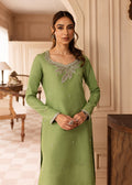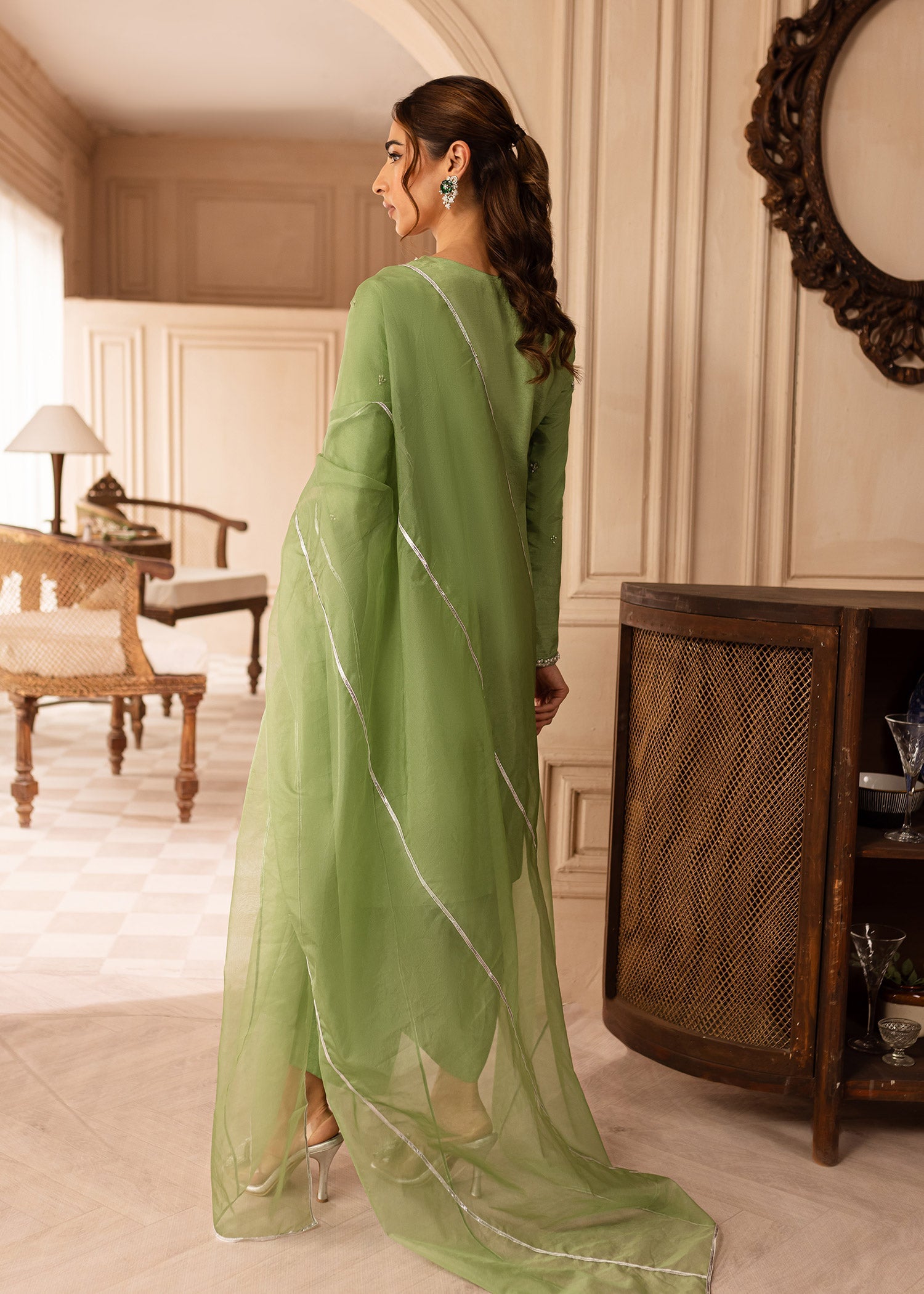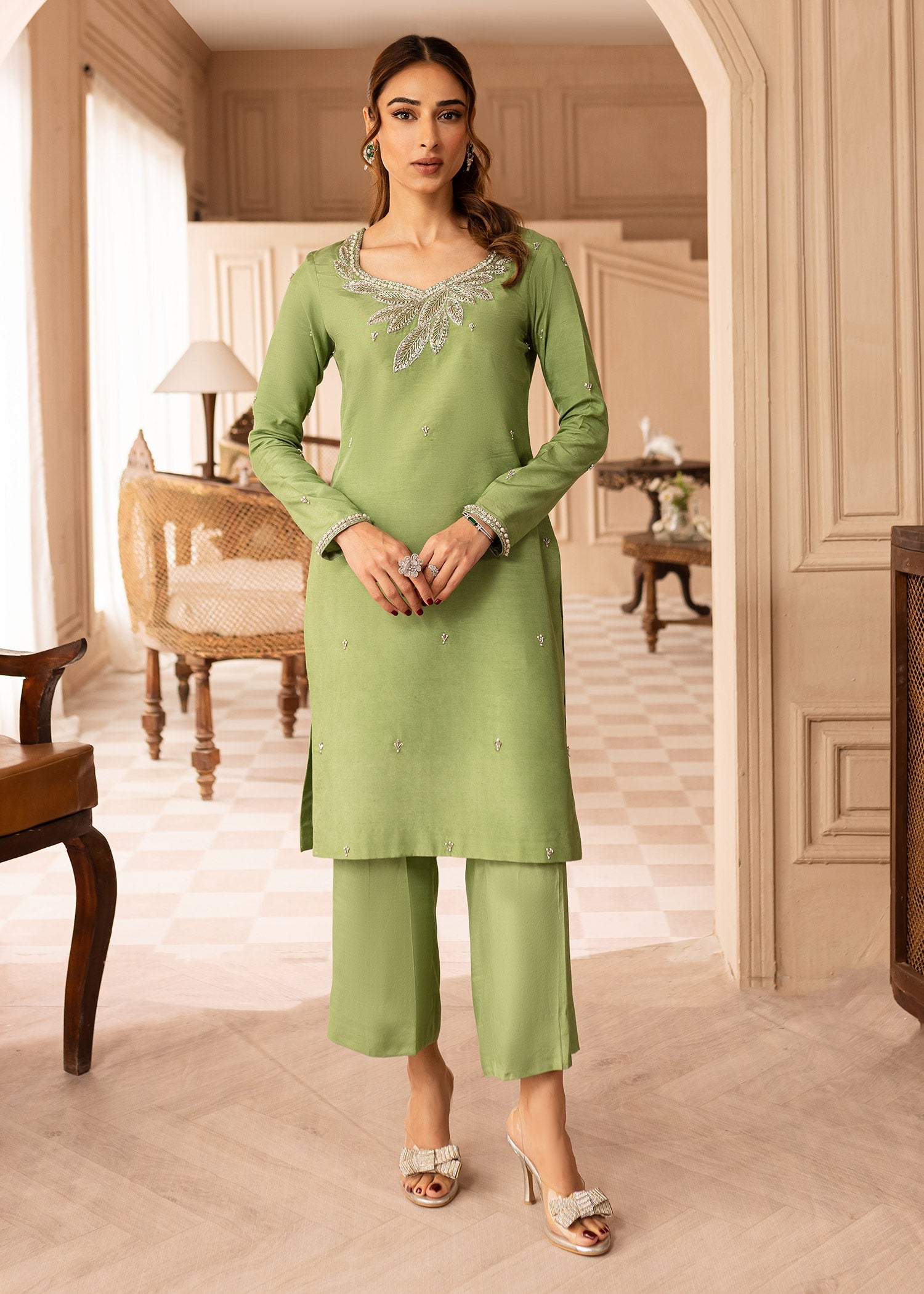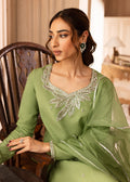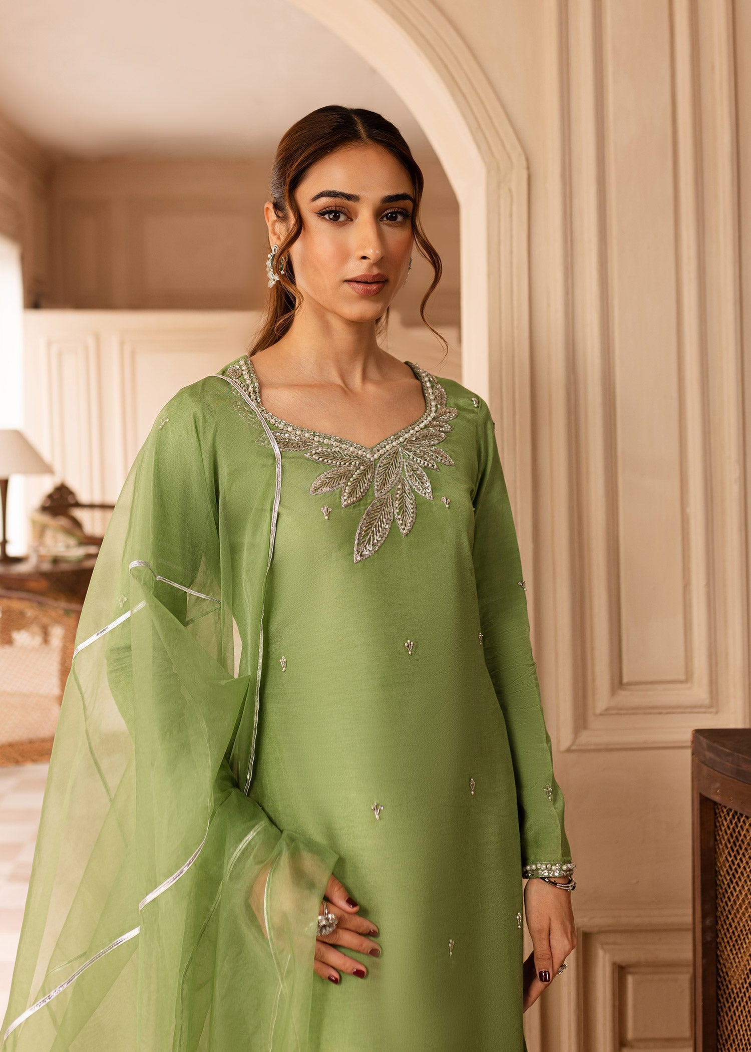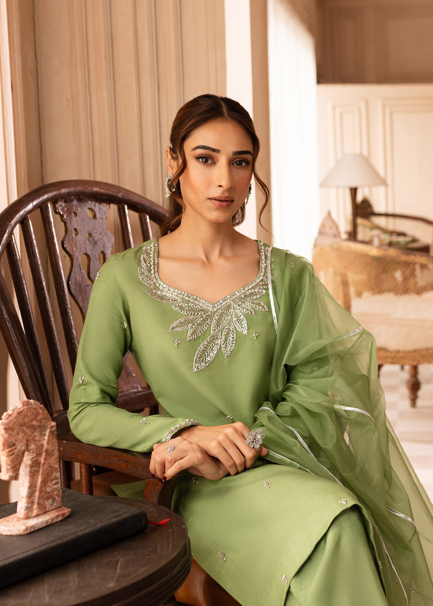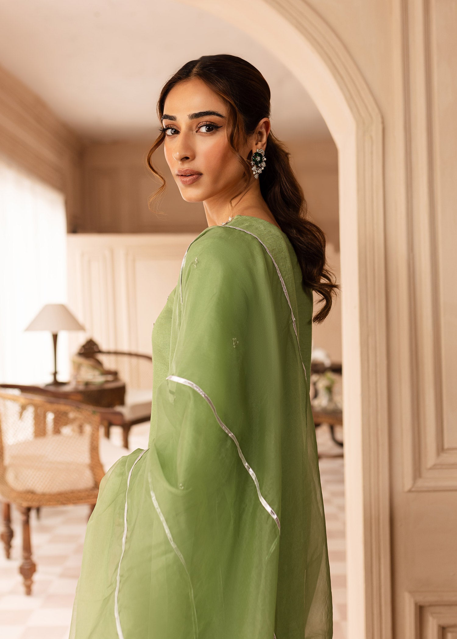 A decent Sage Green raw silk Embellished shirt with details of Silver Pipe, sitara, pearl and Nakshi. This medium length shirt is paired with straight pants and Organza dupatta with gota details. The look is perfect for a very chic and feminine allure.