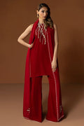 Achieve an ethereal charm in this deep red velvet outfit. The short shirt is beautifully detailed with intricate embellishments around the neckline, showcasing refined at its finest. Paired with elegantly tailored boot-cut pants and a fluid medium silk dupatta detailed along the borders, Allure is a true reflection of modern grace.