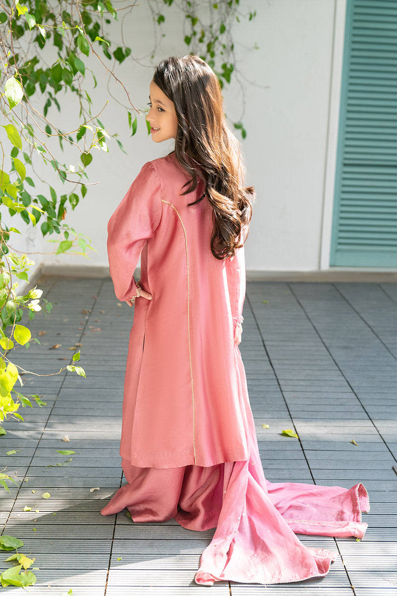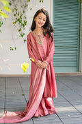 Draped in a soft and graceful almond pink hue, this exquisite ensemble is crafted from pure sheesha silk for both the shirt and pants, exuding a regal charm. The look is elevated with a stunning ombre medium silk dupatta, delicately sprinkled with sequins for a luminous touch.