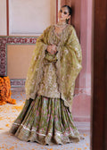 A modern take on classic charm, this angrakha-style ensemble is a perfect blend of elegance and artistry. The short angrakha top is adorned with embroidered panels and highlighted with gota lace detailing, layered over a refined Korean silk bustier. It is paired with screen-printed crushed pants with gotta pattis in matching Korean fabric, adding texture and movement to the look. The katan organza dupatta, featuring an all-over embroidered spray, delicate ada work, and a richly detailed border, completes the outfit with timeless sophistication.
