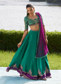 A vibrant ode to craftsmanship and color, this emerald and purple ensemble brings together traditional artistry with modern finesse. The block-printed choli shimmers with intricate handwork — kora, dabka, nakshi, resham, and crystals — creating a tapestry of texture and light. Paired with a delicately hand-embellished deep purple net dupatta and a graceful raw silk lehenga finished with subtle embroidery and playful tassels, this look is equal parts striking and sophisticated — made to dazzle at any festive celebration.