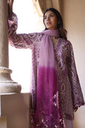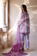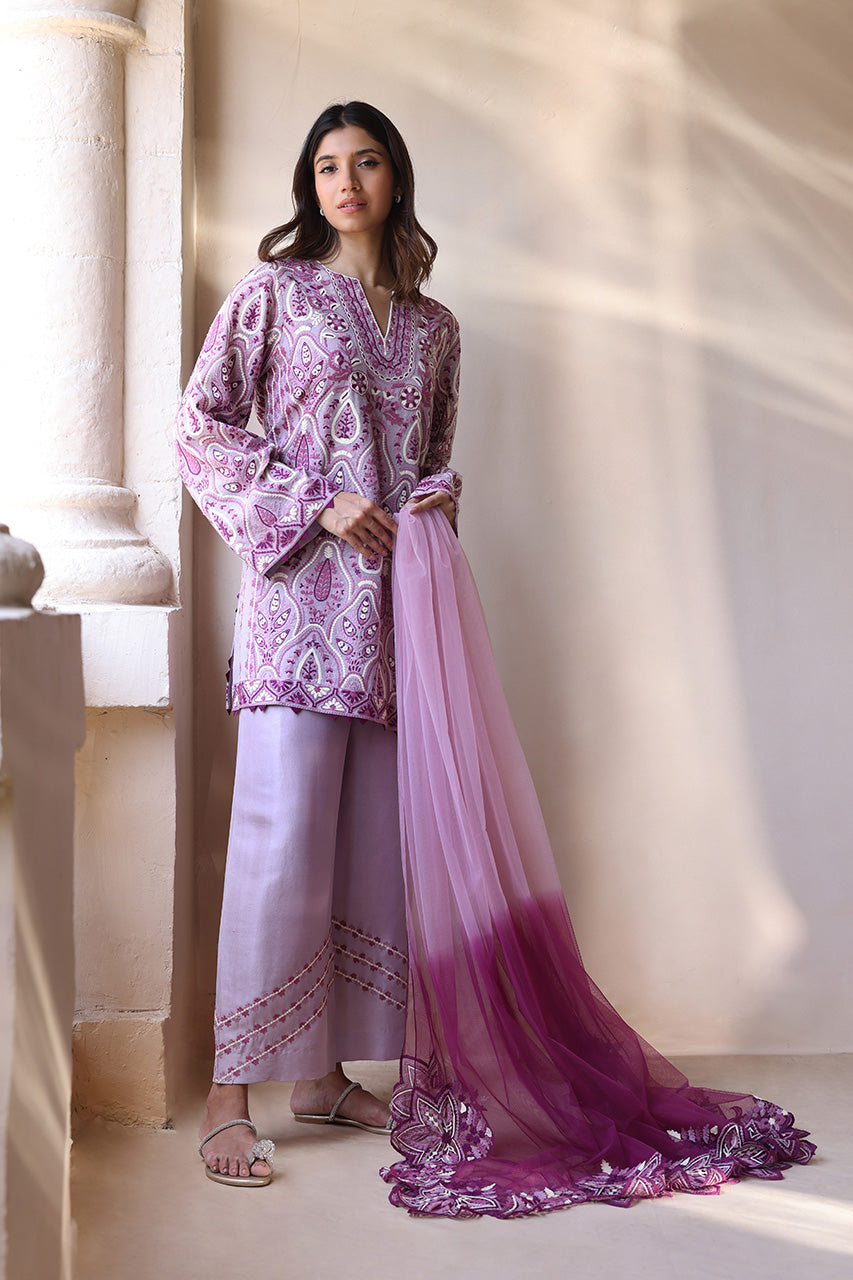 A vision of elegant sophistication, this lined khaddi corduroy kurta in a lilac hue is adorned with intricate paisley and geometric aari embroidery. A scalloped pallu with floral aari embellishment enhances the lilac and plum ombre tulle dupatta, adding a whimsical touch. Paired with exquisitely tailored matching pure rawsilk culottes, subtly accented with artisanal aari embroidery, the look is effortlessly refined yet poised.