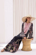 Black kaftan made from pure crepe fabric, featuring a digital print design that complements the fluidity of the silhouette. The neckline is decorated with resham embroidery and handwork, with floral tassels adding a playful touch to the design. The kaftan’s loose fit and soft fabric allow for easy drape and movement, creating a contemporary look with traditional elements.