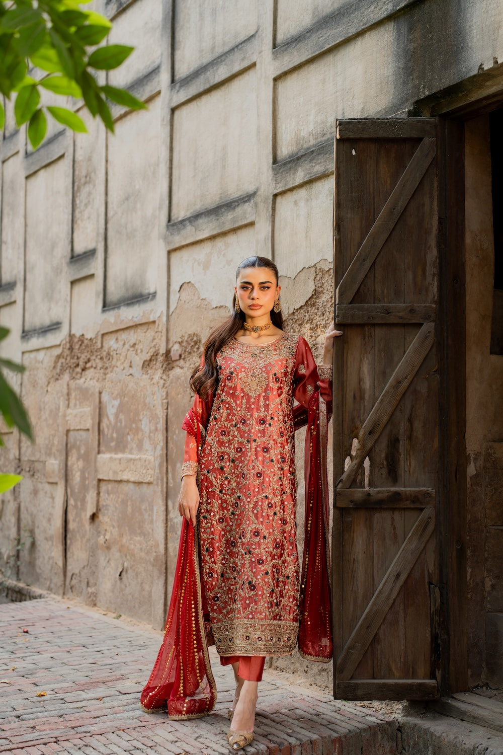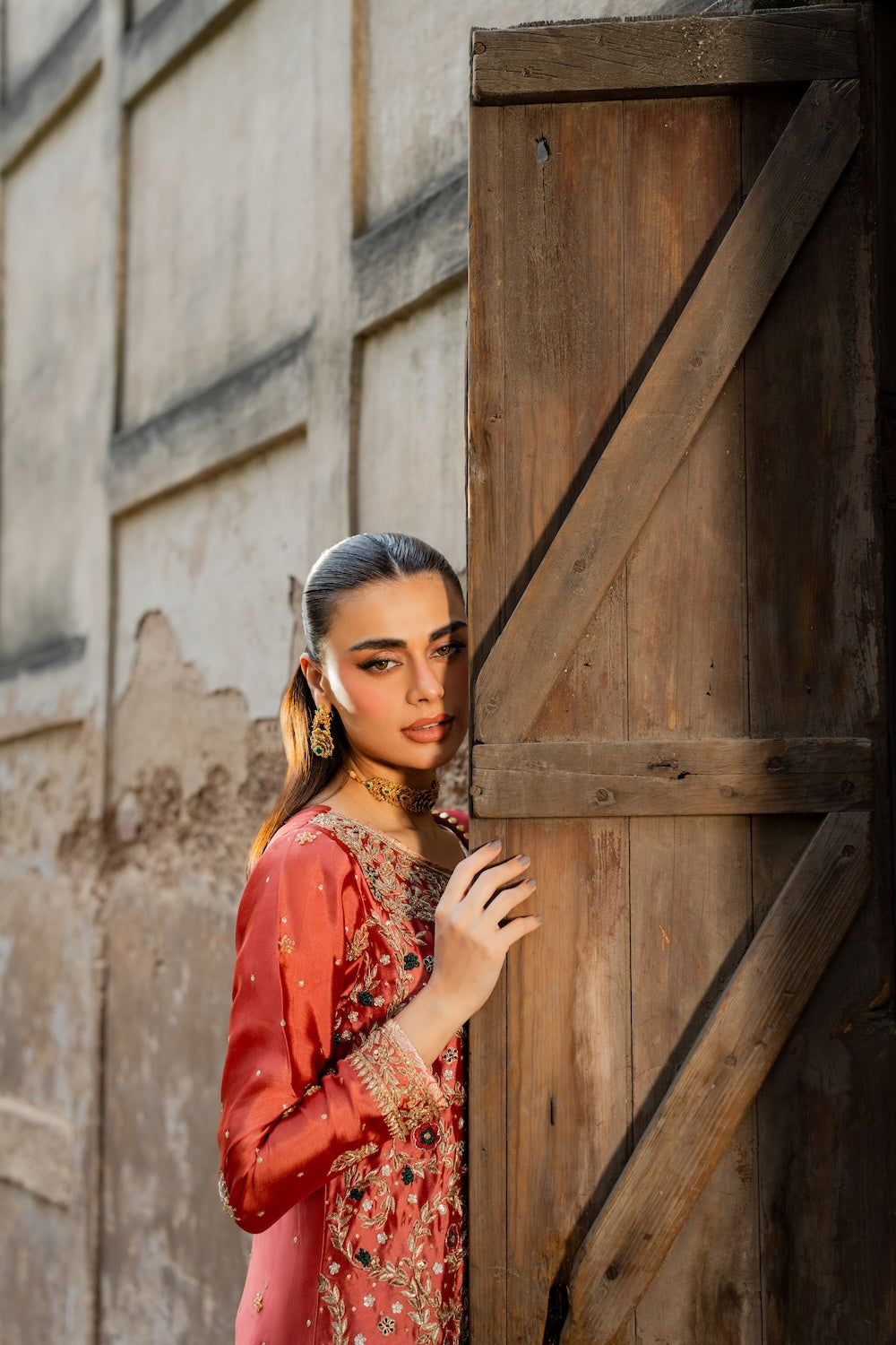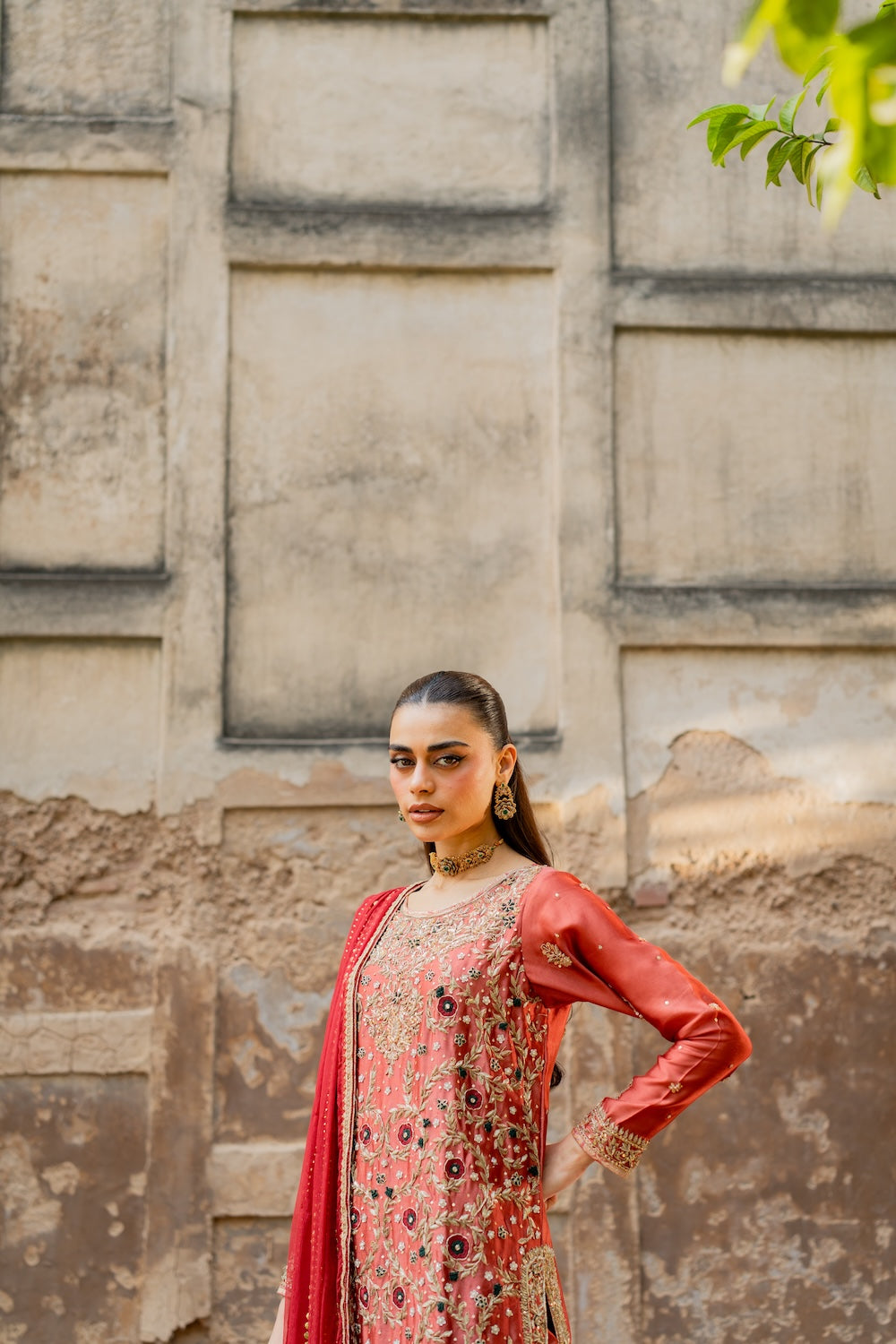 Anisah is a treasure! This coral ensemble dazzles with intricate dabka work, beautifully elevated by green and red threadwork accents. The fuller shirt paired with plain pants strikes the perfect balance, while a heavy dupatta completes this elegant, head-turning look.