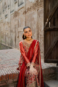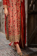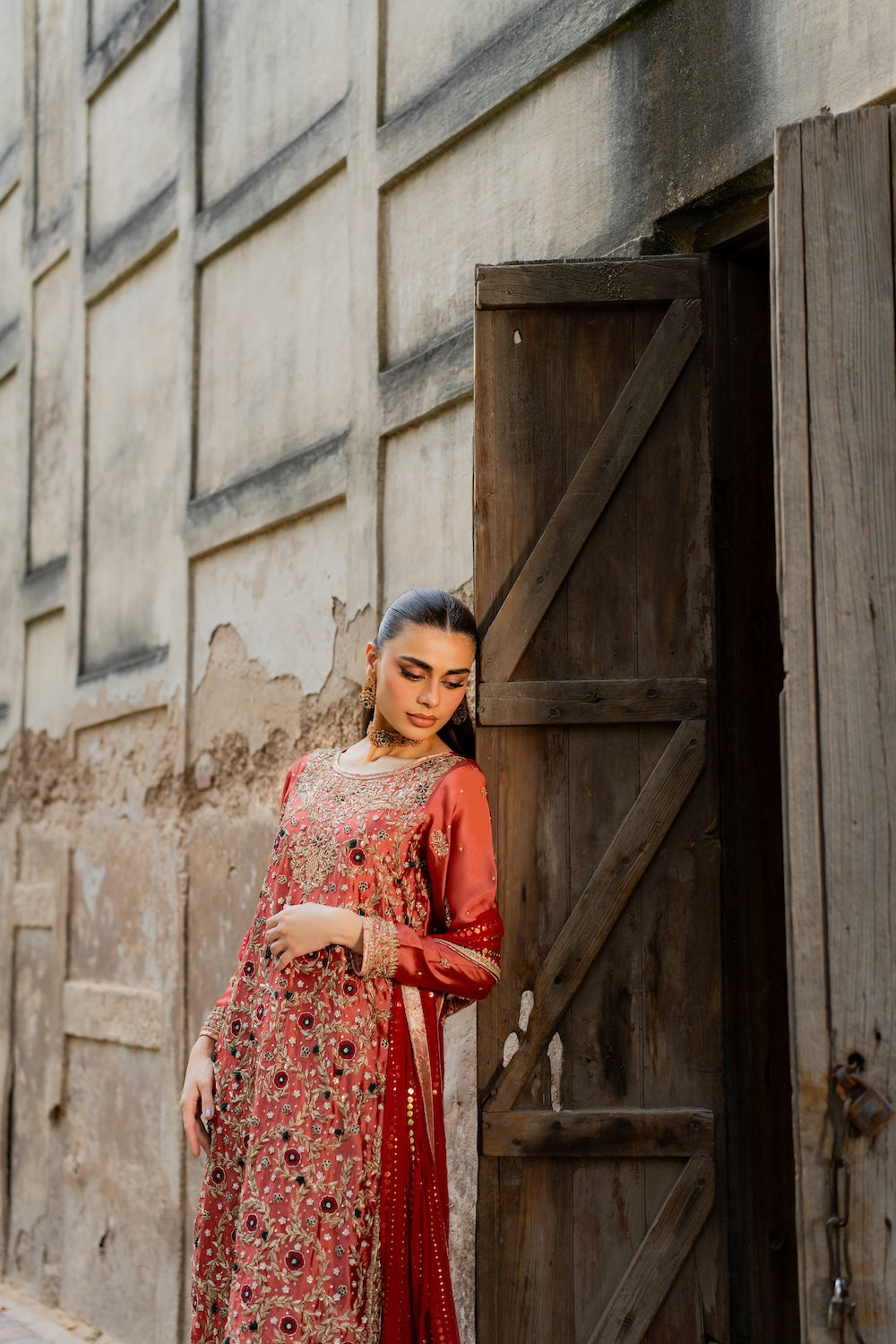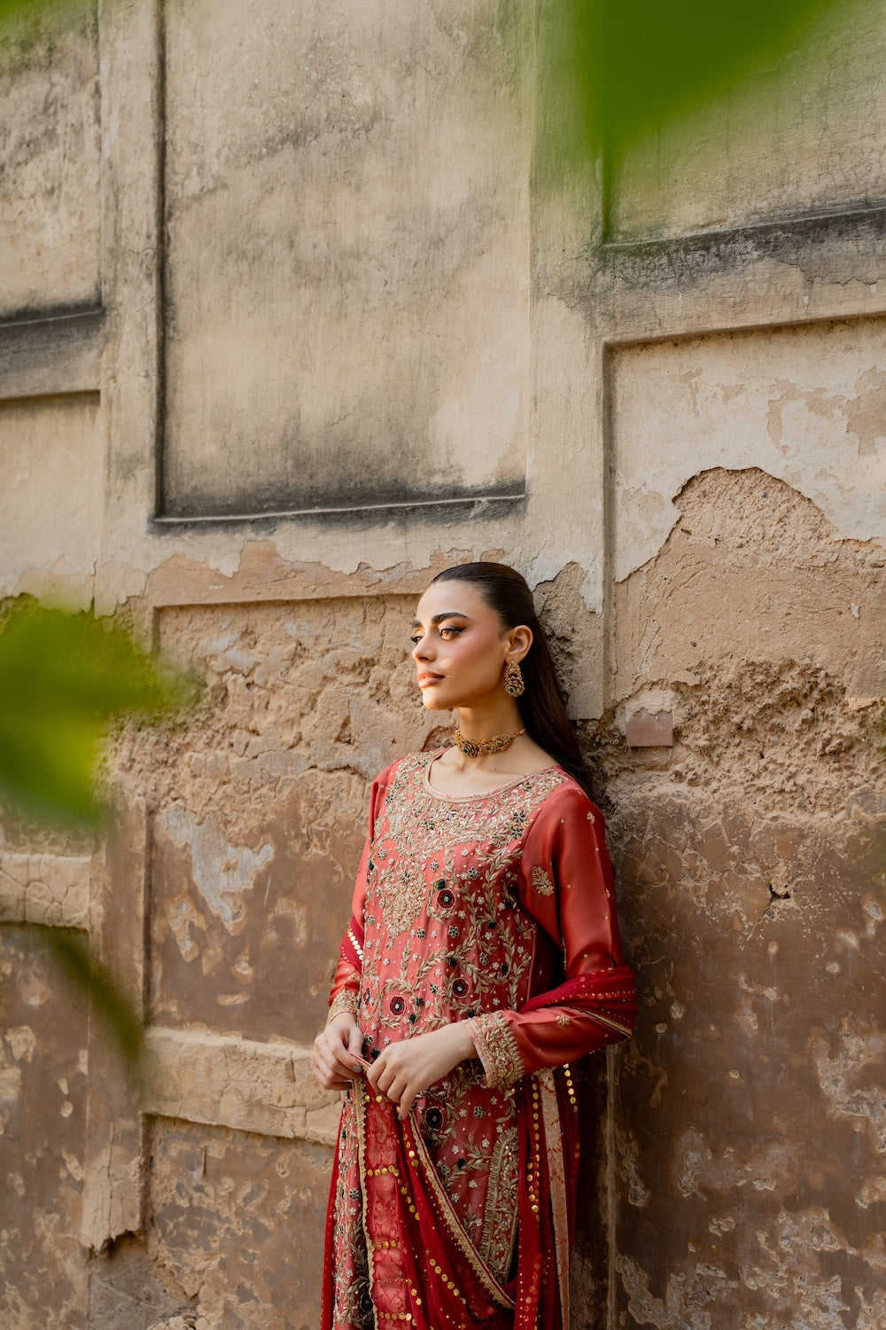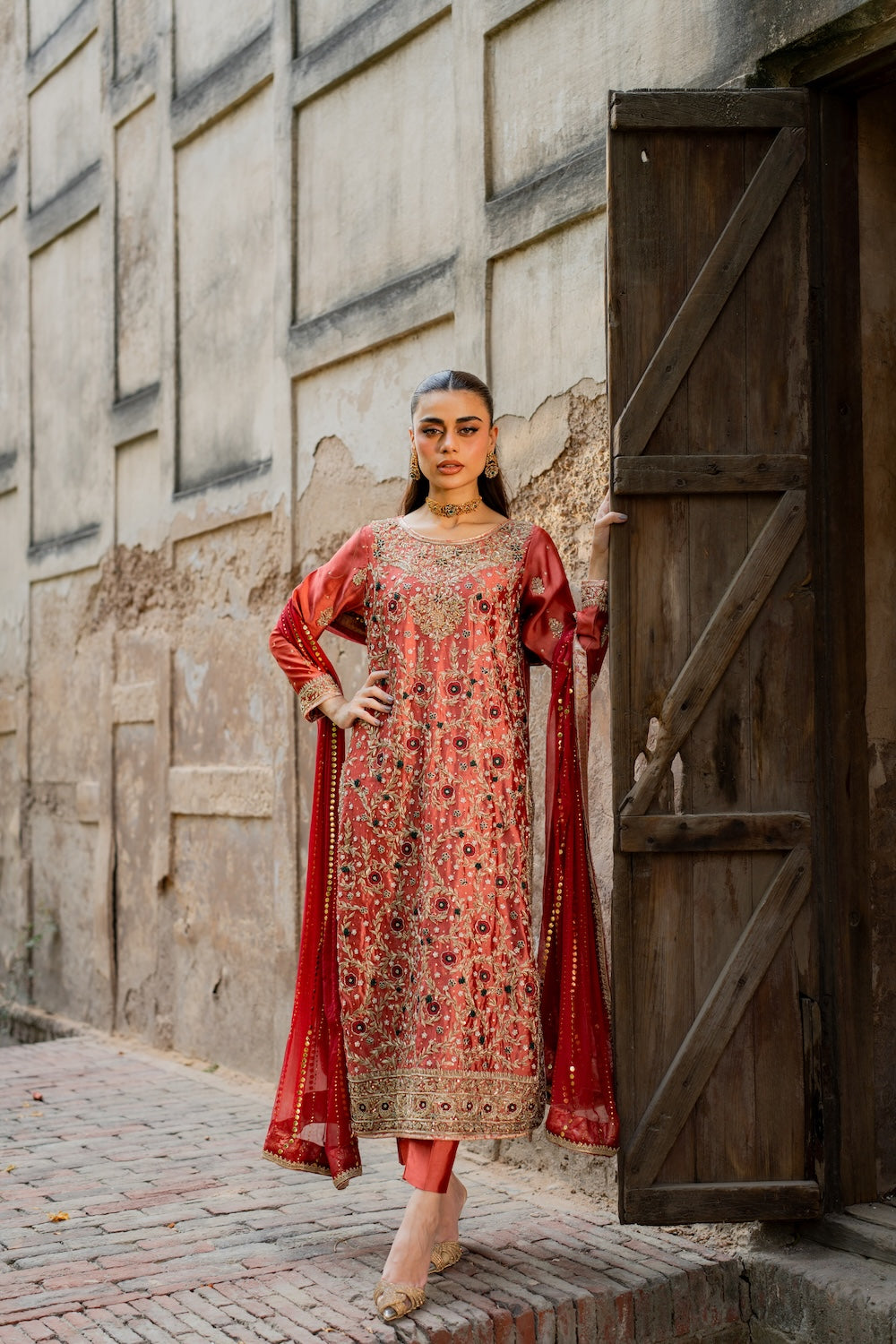 Anisah is a treasure! This coral ensemble dazzles with intricate dabka work, beautifully elevated by green and red threadwork accents. The fuller shirt paired with plain pants strikes the perfect balance, while a heavy dupatta completes this elegant, head-turning look.