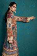 Front open kurta style silhouette print on silk fabric print inspired by Persian carpets and Mughal florals print enhanced with antique gold tila thread delicate zardozi work collar and front open patti Mughal jewelry inspired embellished motifs appliqued on the shirt finished with antique golden tila thread and sequins lace. Pants can be added seperately.