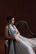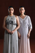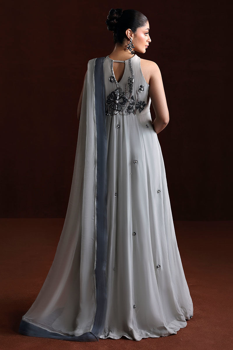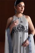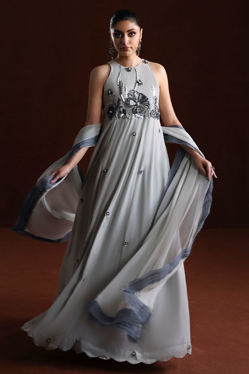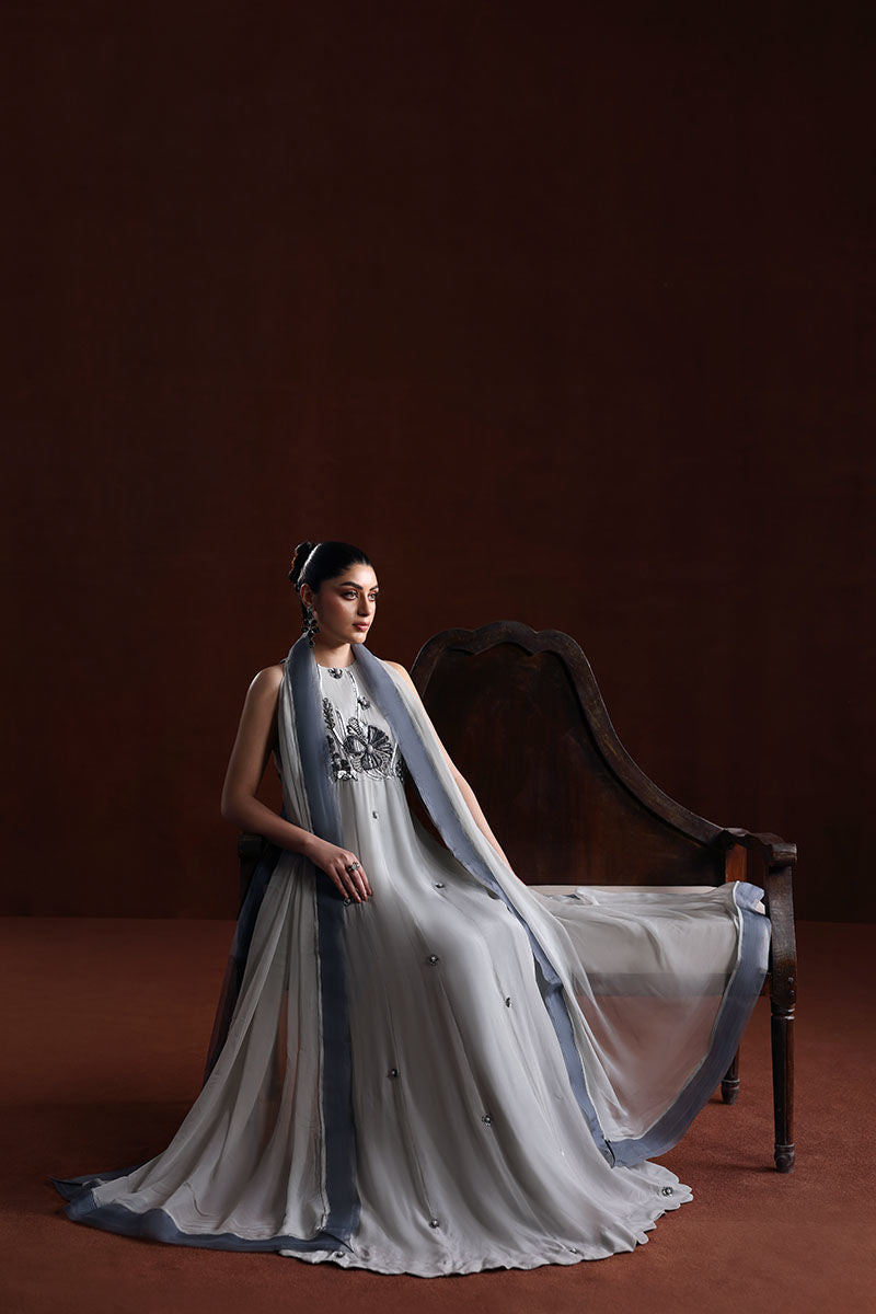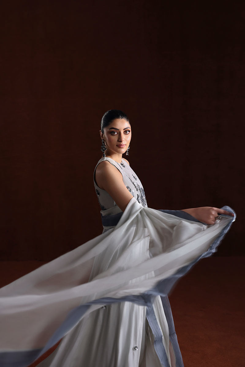 A stylish ensemble featuring a grip fabric frock, medium silk sharara, and a flowy grey chiffon dupatta—a perfect blend of grace and comfort