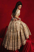 Like its namesake Empress, Arjumand is a study in refined power and poetic beauty. Crafted in off-white Indian silk and blooming with printed appliqués, block print, embroidery, mirror work, and hand adda, it’s a composition both painterly and precise. The choli features a delicately cut floral neckline and half sleeves embroidered with metallic thread vines, scattered with sequins and glinting beadwork. The lehenga tells its own story: peach-colored blossoms and jade green leaves swirl into wide panels that open like Mughal fans, evolving into floral scallops and ending in a repeat border of flowers. Multiple Mughal-inspired borders rim the hem, densely embroidered in thread, sequins, and mirrorwork. The organza dupatta echoes these floral roundels, its motifs encased in decorative frames and lit with subtle embroidery. Trims run all around the border, finished with tassels that swing like flirtation itself.