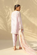 Rendered in a delicate whisper of lilac, this breezy khaddi corduroy kurta is adorned with intricate cutwork lace along the neckline, cuffs, and hem, exuding effortless sophistication. A diaphanous organza dupatta with a lilac hued cherry blossom inspired print adds a touch of whimsy. Paired with tailored pure rawsilk tulip pants edged in scalloped detailing, it redefines minimal elegance with poetic restraint.