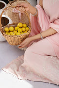 Long kurti in powder pink raw silk, designed with a halter neckline. The neckline is finished with anchor thread embroidery and features cutwork detailing along the edges. The kurti has a straight silhouette with clean side seams. Paired with a raw silk izaar, finished with lace detailing on the side slit. The dupatta is in medium-weight silk, scattered with anchor thread bootis across the fabric, spaced evenly for balance.