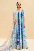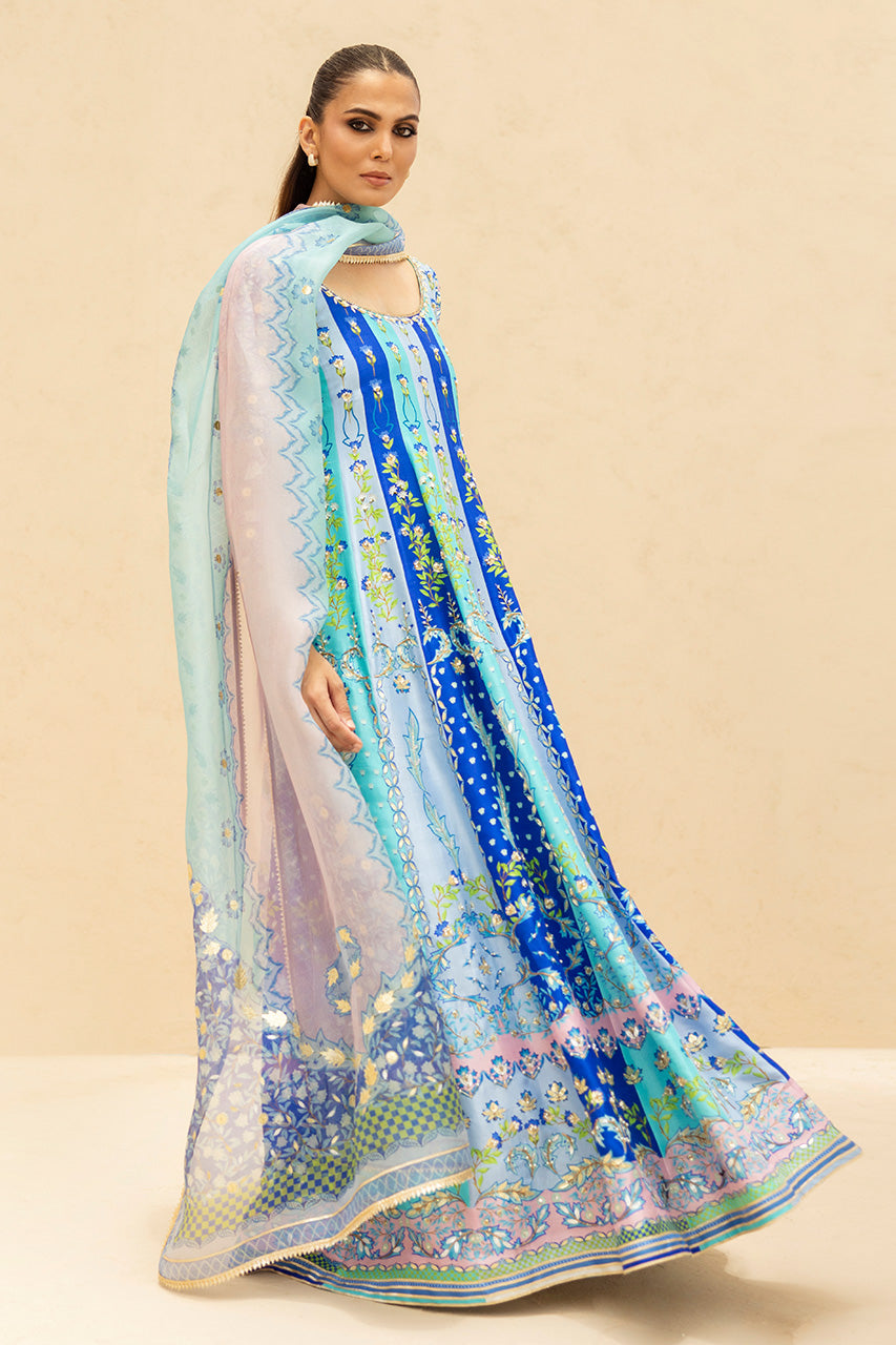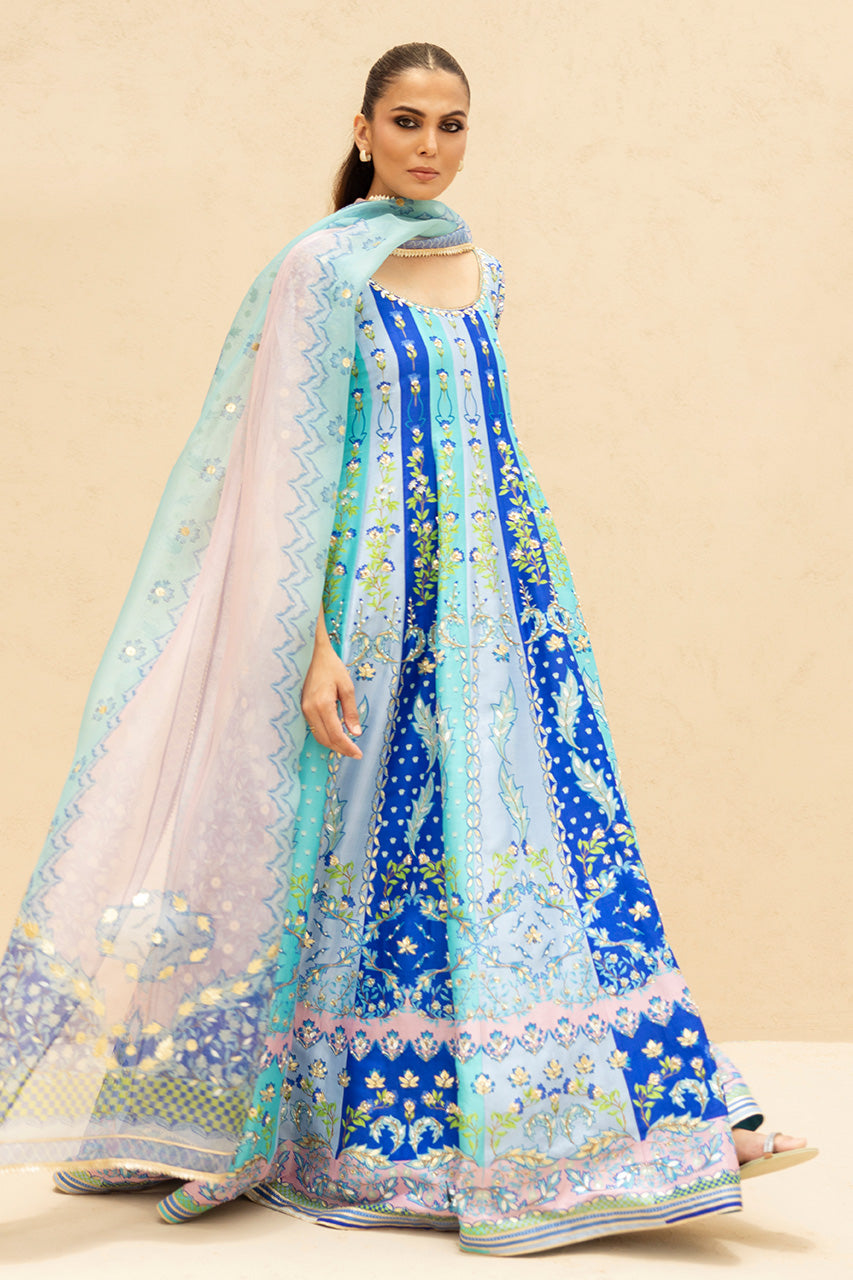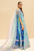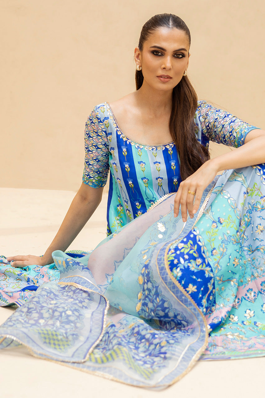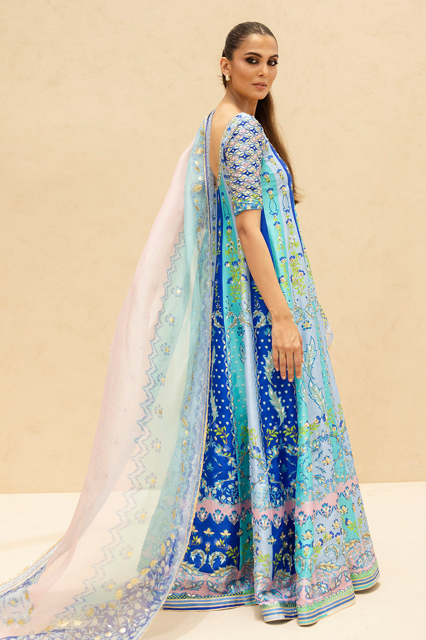 A kaleidoscope of aqua, powder blue and cobalt, this kalidaar peshwas captures the joy of summer skies and secret gardens. Crafted from fluid pure rawsilk, the silhouette drapes with effortless grace, adorned with an abstract botanical print and touches of gota embroidery. The bodice fits softly before unfolding into a cascade of panels. Paired with a gossamer organza dupatta in blush and aqua, edged with delicate gota work, the ensemble evokes a tale of whimsy and wanderlust.