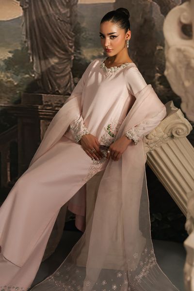 Aylin is an ethereal powder-pink raw silk straight shirt, adorned with intricate 3D embellishments along the neckline and cuffs. The whole look is elevated with flared raw silk pants and an organza dupatta delicately framed with sequin borders, striking the perfect balance between grace and elegance. Refined yet timeless, this look embodies pure sophistication.