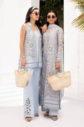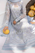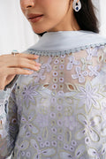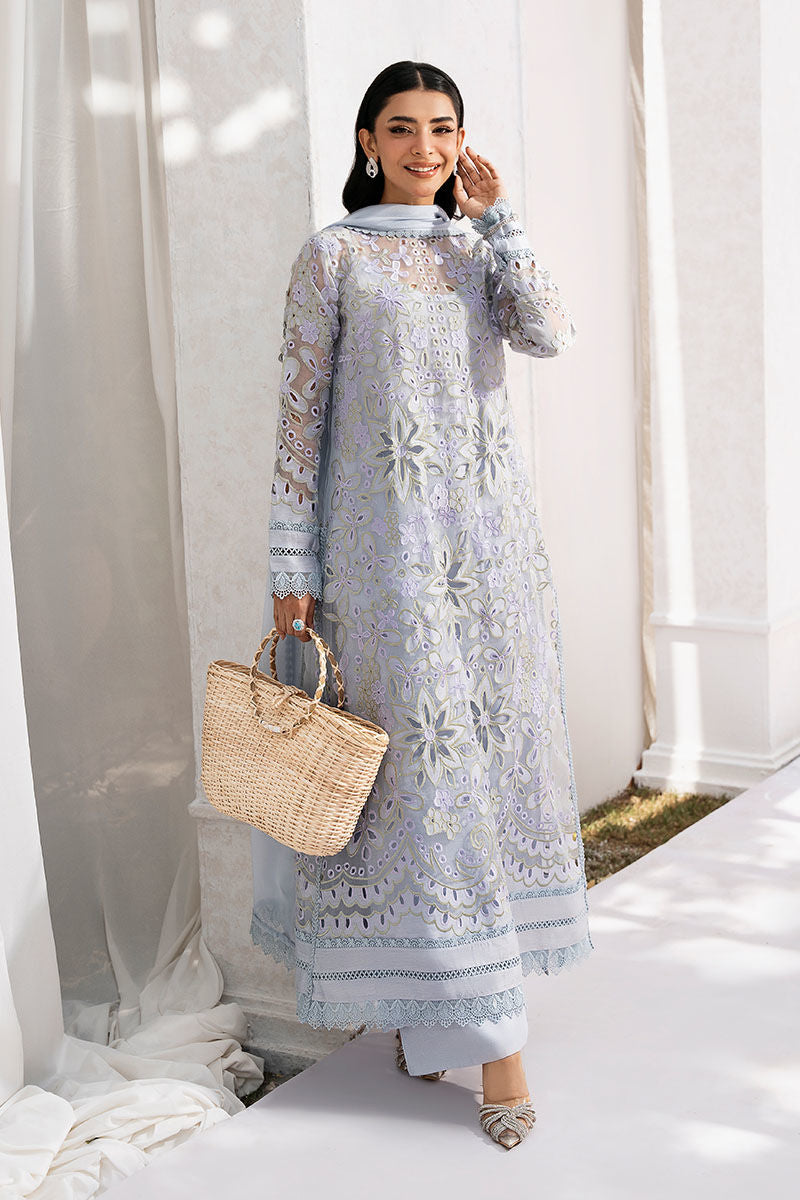 Baby blue organza kurta with fitted sleeves and a band collar. The shirt features oversized khaddi silk appliqué with cutwork detailing, placed throughout for a textured look. Paired with matching floor-length wide-leg pants in the same shade. The medium silk dupatta is finished with scattered organza appliqué bootis.