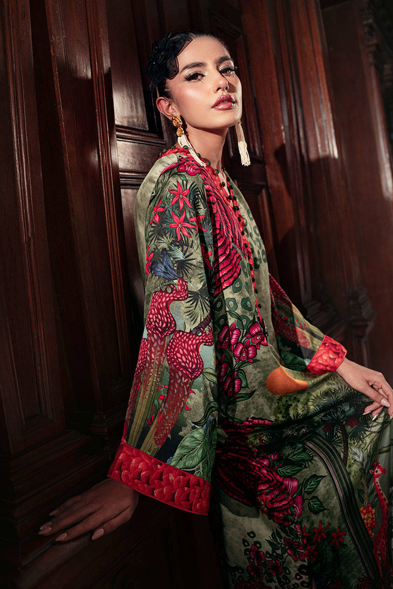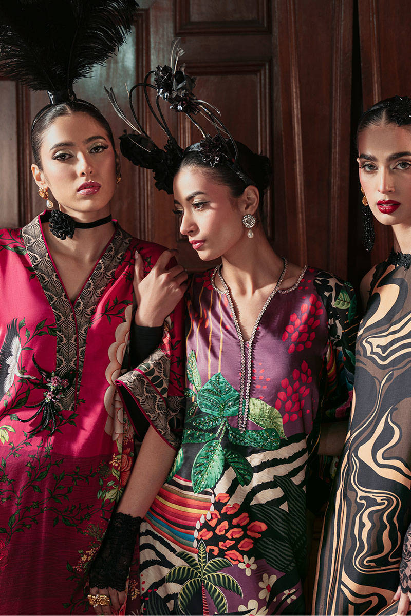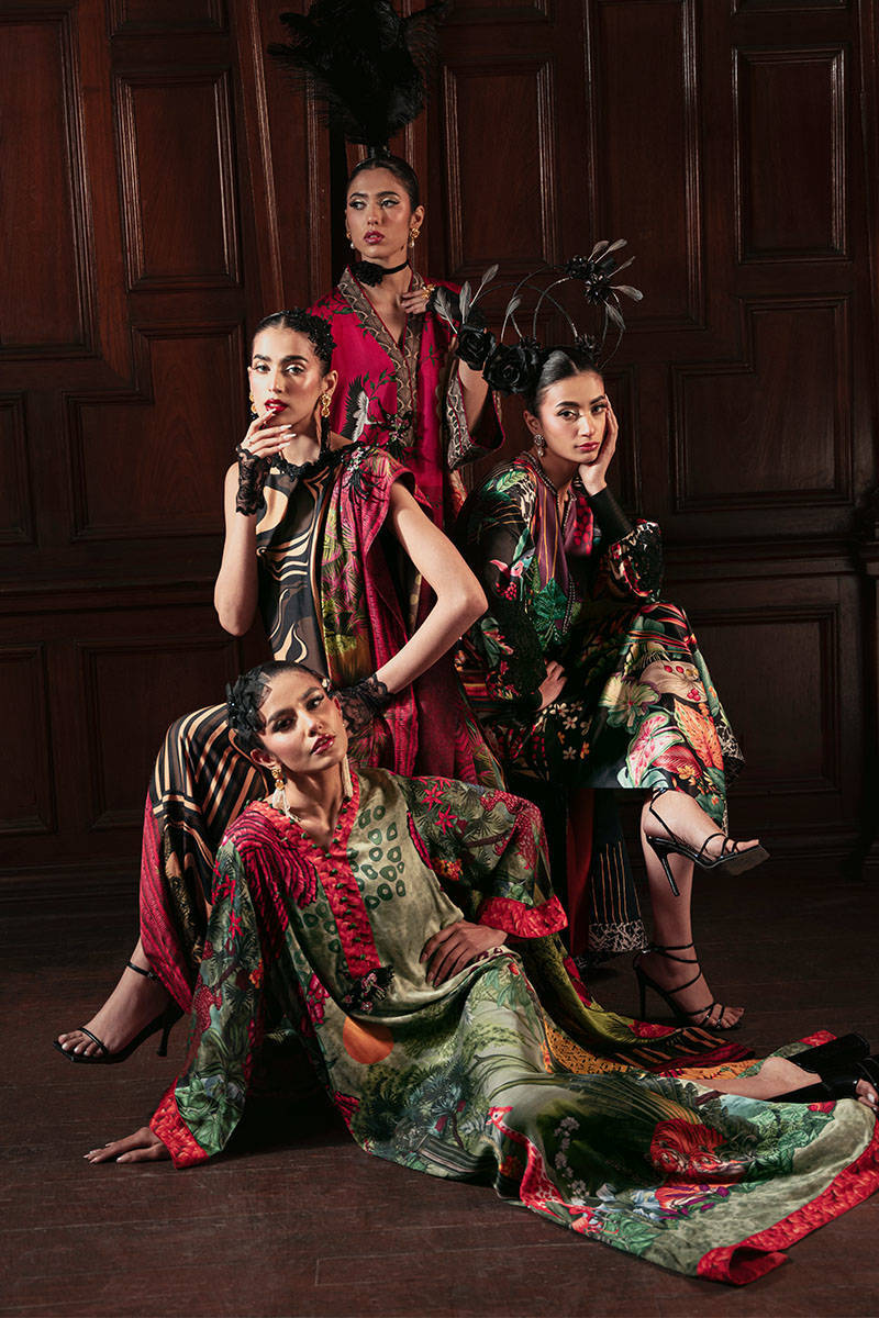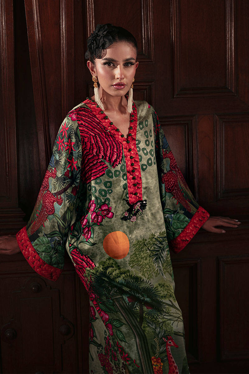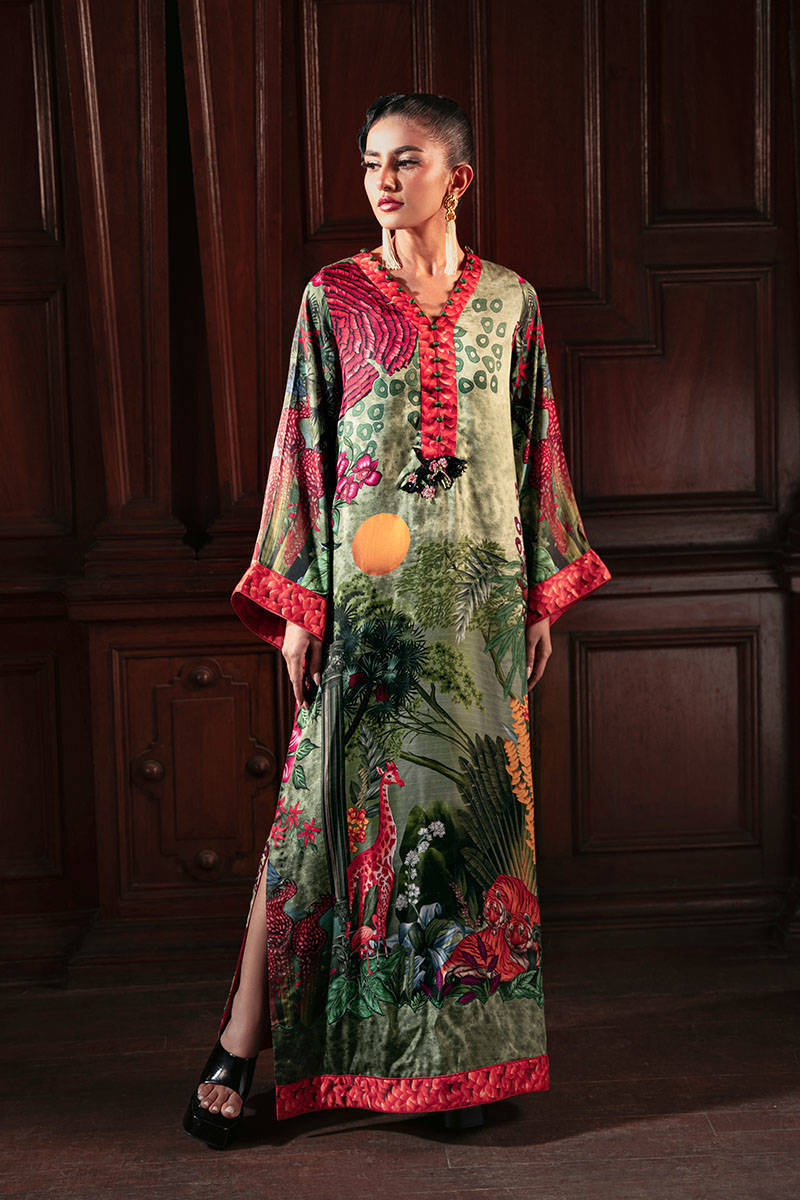 "Bangoli Tiger" is a head turner kaftan that blends daring animal print with a high side slit for a bold, contemporary edge. The hand-embellished motif injects an artistic flair, while the flowing silhouette gracefully accentuates the figure with modern sophistication. This luxurious piece is the epitome of effortless elegance, making it the ideal choice for any special occasion or festive event, perfectly balancing contemporary style with timeless allure.