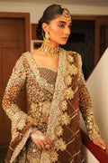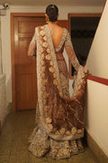 A dazzling showstopper deep brown colored ensemble is a masterpiece of intricate hand embellishment. The fully hand-embellished shirt, mermaid cut lehnga, and four-sided border dupatta adorned with nakshi dabka, sequins, crystals, and stones exude elegance and modern charm. The fitted shirt features a sweetheart embellished neckline and fitted full sleeves, while the back boasts a deep embellished round neck. Ideal for brides seeking a blend of timeless elegance and contemporary style.