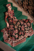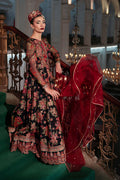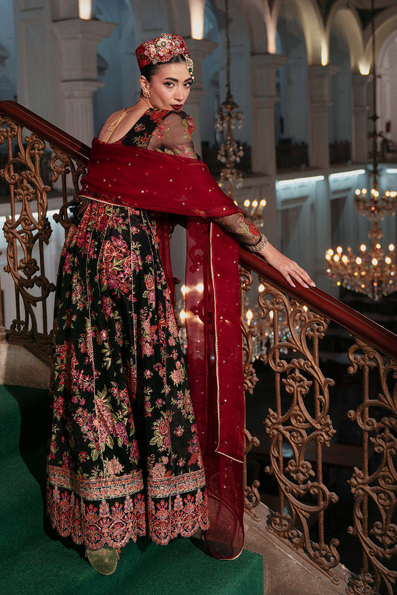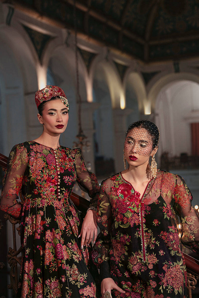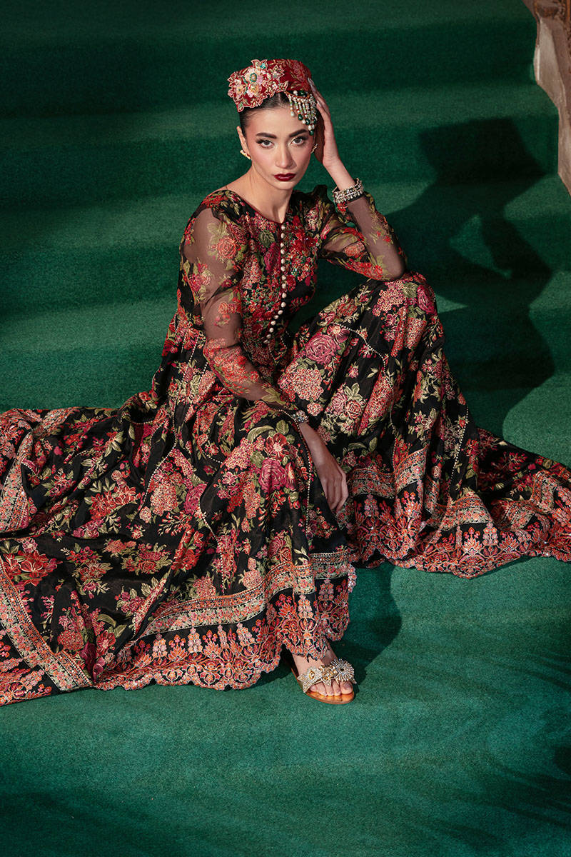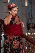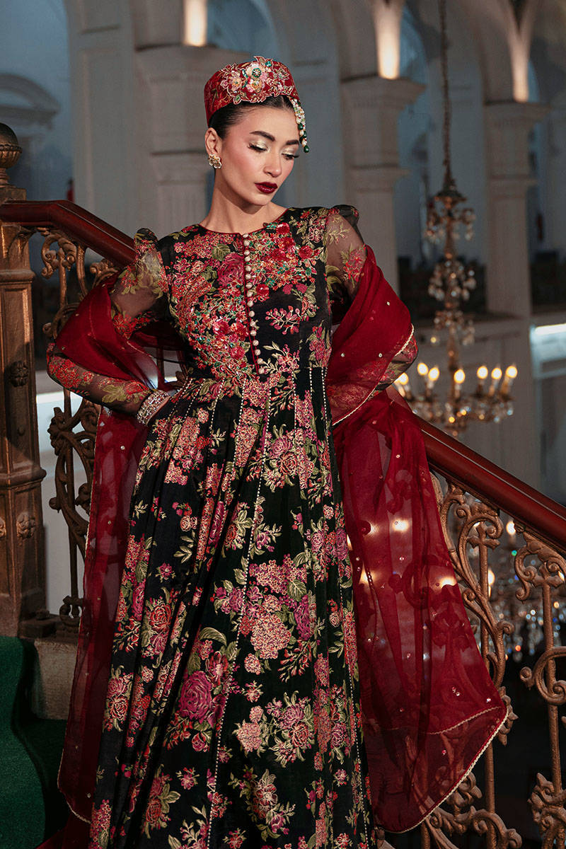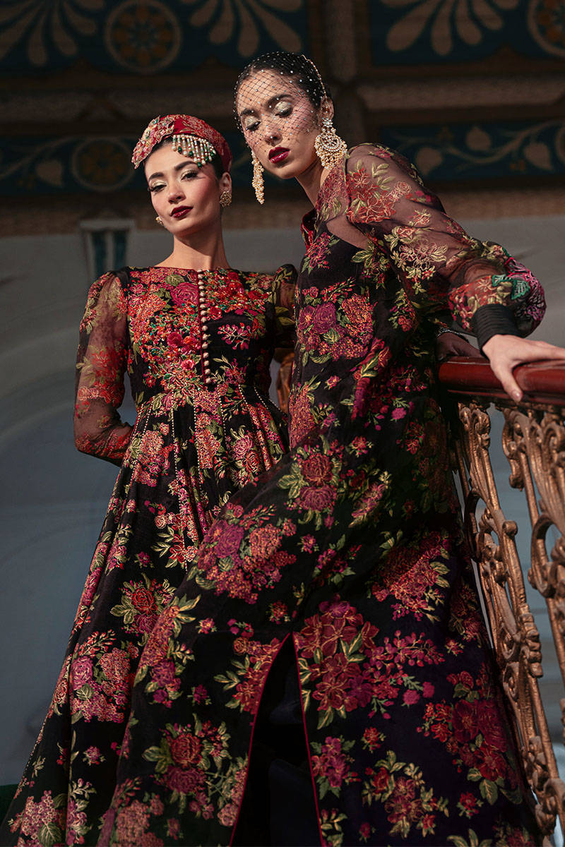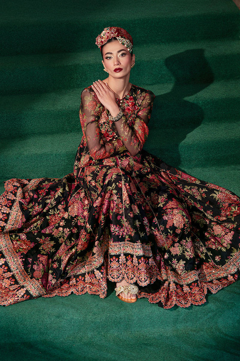 "Black Dahlia" is a captivating black raw silk kalidar, adorned with a delicate floral print and intricate hand embellishments on the bodice, highlighted by elegant gold loop button detailing. The lavishly embroidered borders along the hem add a dramatic touch, elevating the outfit’s elegance. The sophistication of the design is further enhanced by stunning organza puff sleeves, adding a modern yet regal flair. Paired with matching trousers and a contrasting red organza dupatta, delicately embellished with a sequin spray, this ensemble strikes the perfect balance of grace and glamour. Timeless and refined, "Black Dahlia" is the ultimate choice for any special occasion, exuding sophistication in every detail.