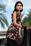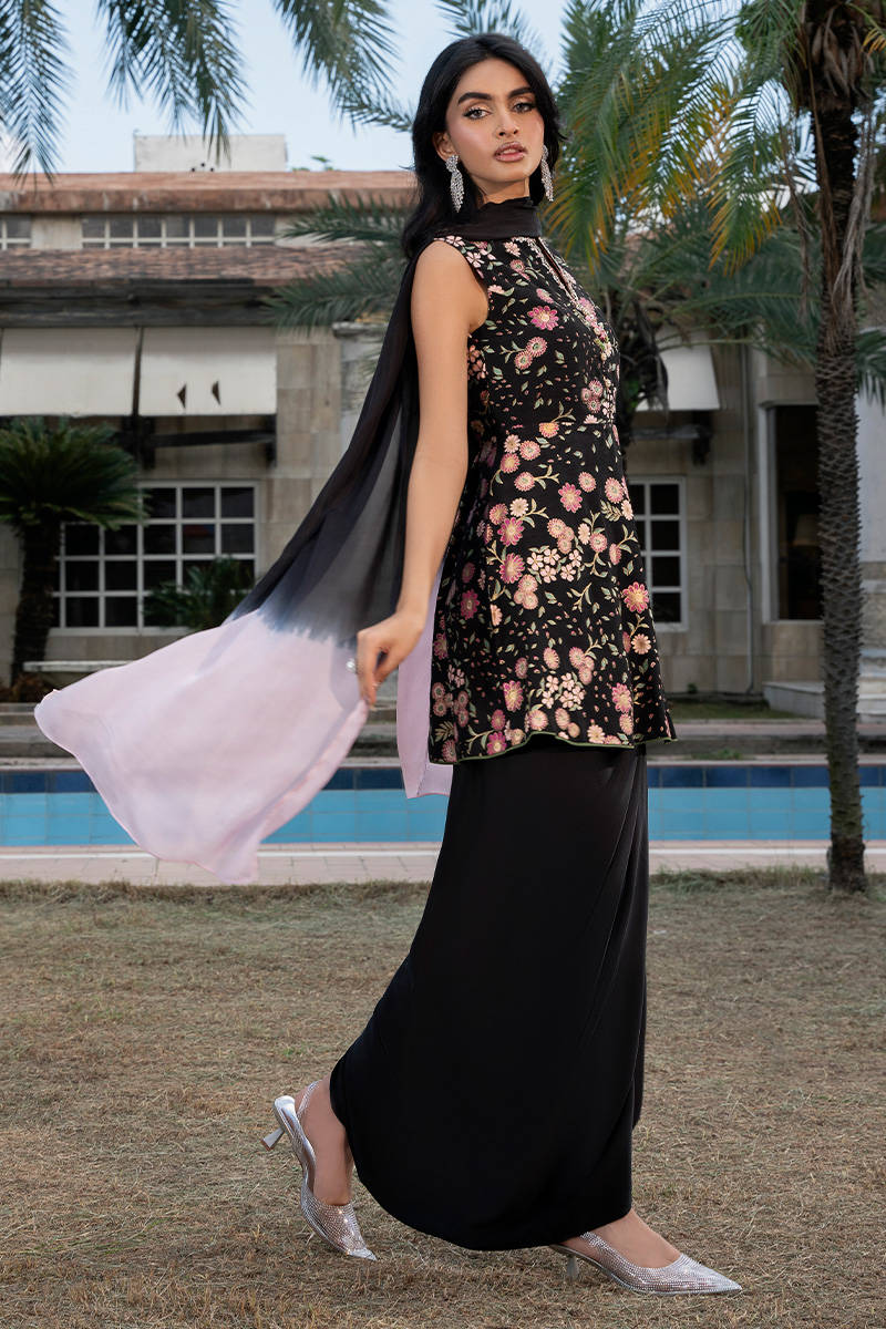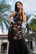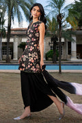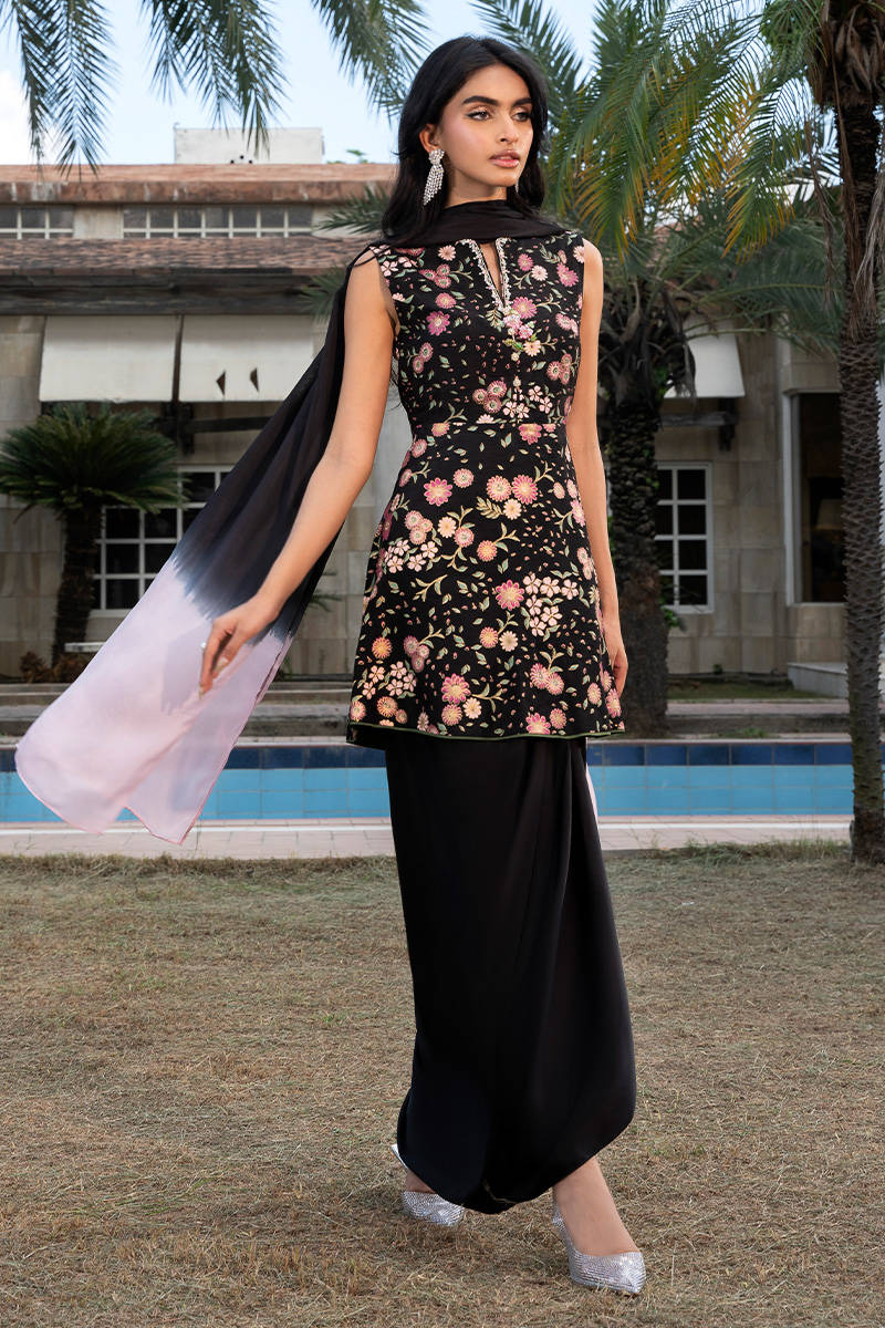 Black Daisy is a classic black screen-printed sleeveless peplum, featuring intricate hand embellishments and delicate stitching details that elevate its timeless appeal. It is paired with an eye-catching silk sarong, adding a bold, modern twist to the ensemble. The look is completed with a beautifully draped ombré scarf, bringing together elegance and contemporary charm in a standout silhouette.