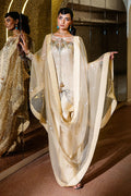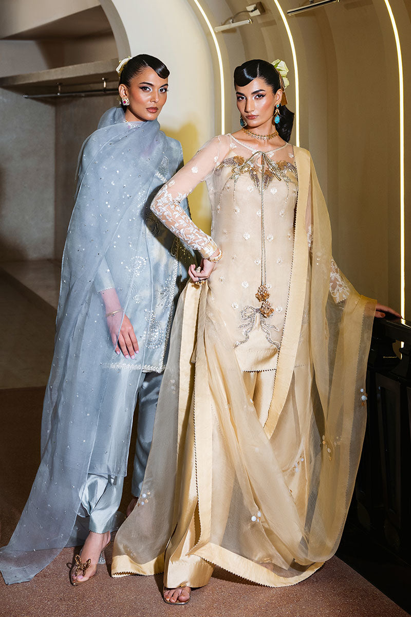 Includes: Shirt with Shalwar Bloomingdale - A soft beige ensemble featuring a mid-thigh organza shirt adorned with hand-embellished birds, dabka, naqshi, crystals, and sequins. Finished with a keyhole neckline and tassels, paired with a farshi shalwar in tissue silk and an organza dupatta detailed with lace and borders. Timeless elegance, redefined.