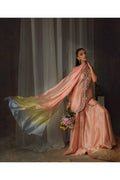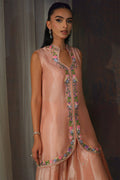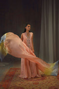 Tailored from shimmering zari net in a delicate peach hue, its surface catching the light with a subtle, ethereal glow. The jacket-style shirt features a scalloped front, richly hand-embroidered with French knot roses, trailing vines, and sequins that glisten with every movement. Paired with an embroidered flowing lehnga in matching zari net, the look is completed by a medium silk dupatta—ombre-washed with delicate sequence work. Feminine yet contemporary, this piece transitions effortlessly from daytime celebrations to evening elegance.