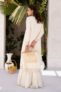 An elegant all-ivory ensemble featuring a front-open, full-sleeved jacket paired with a sleeveless inner, both crafted from the finest raw silk and adorned with intricate Kashmiri embroidery. The dupatta offers a contemporary twist on traditional chatta-patti, enhanced with delicate, artisanal embroidery. A crushed dhaaka lends the perfect touch of texture and movement, completing the look with grace and understated sophistication.