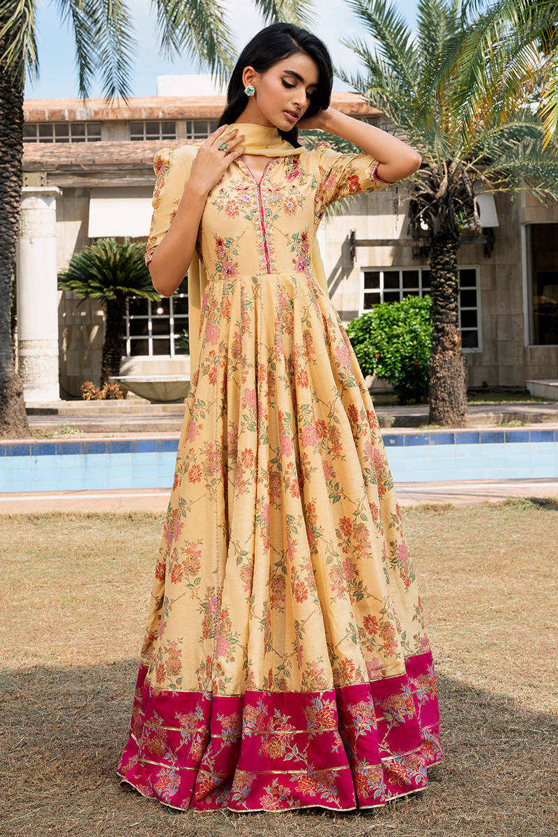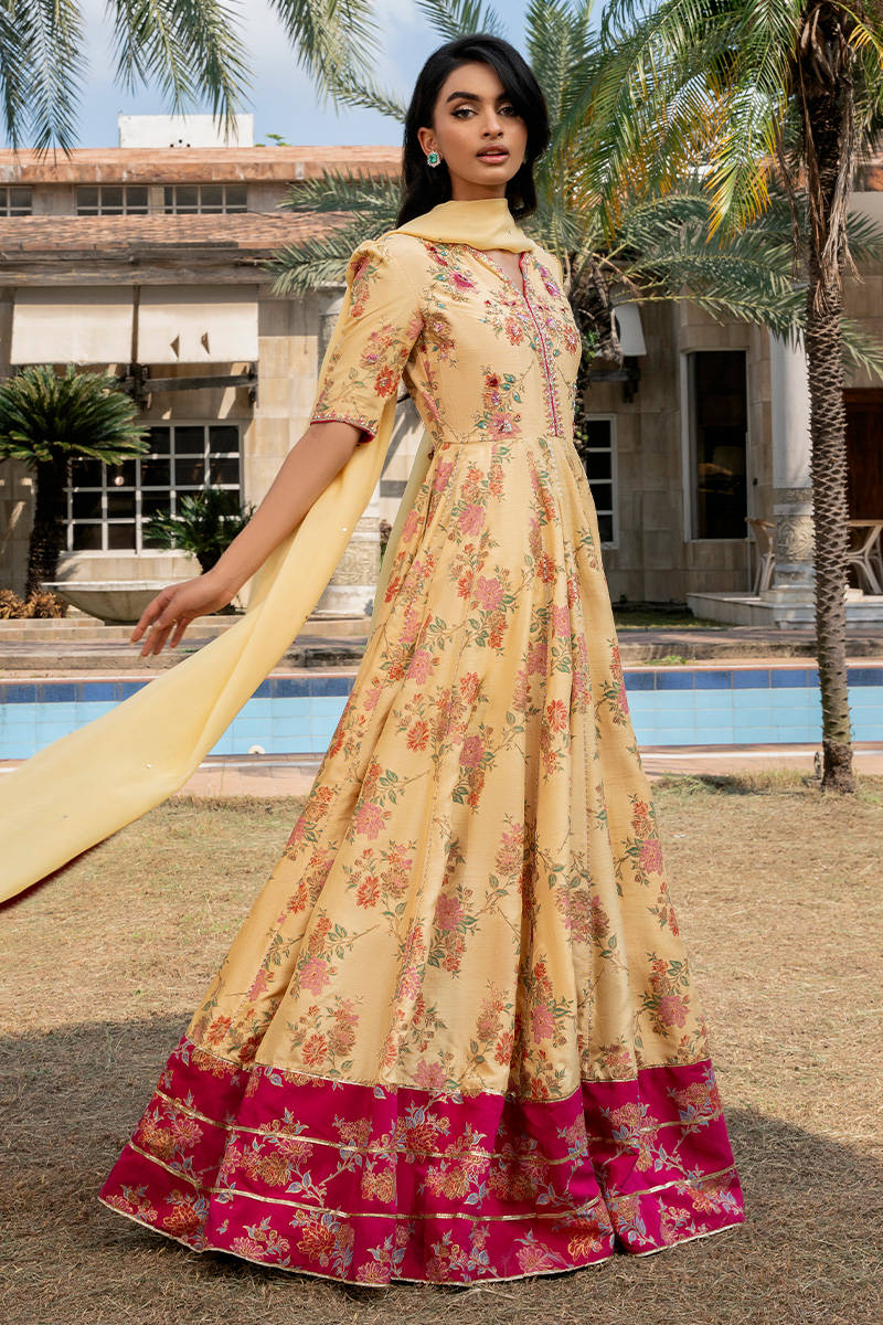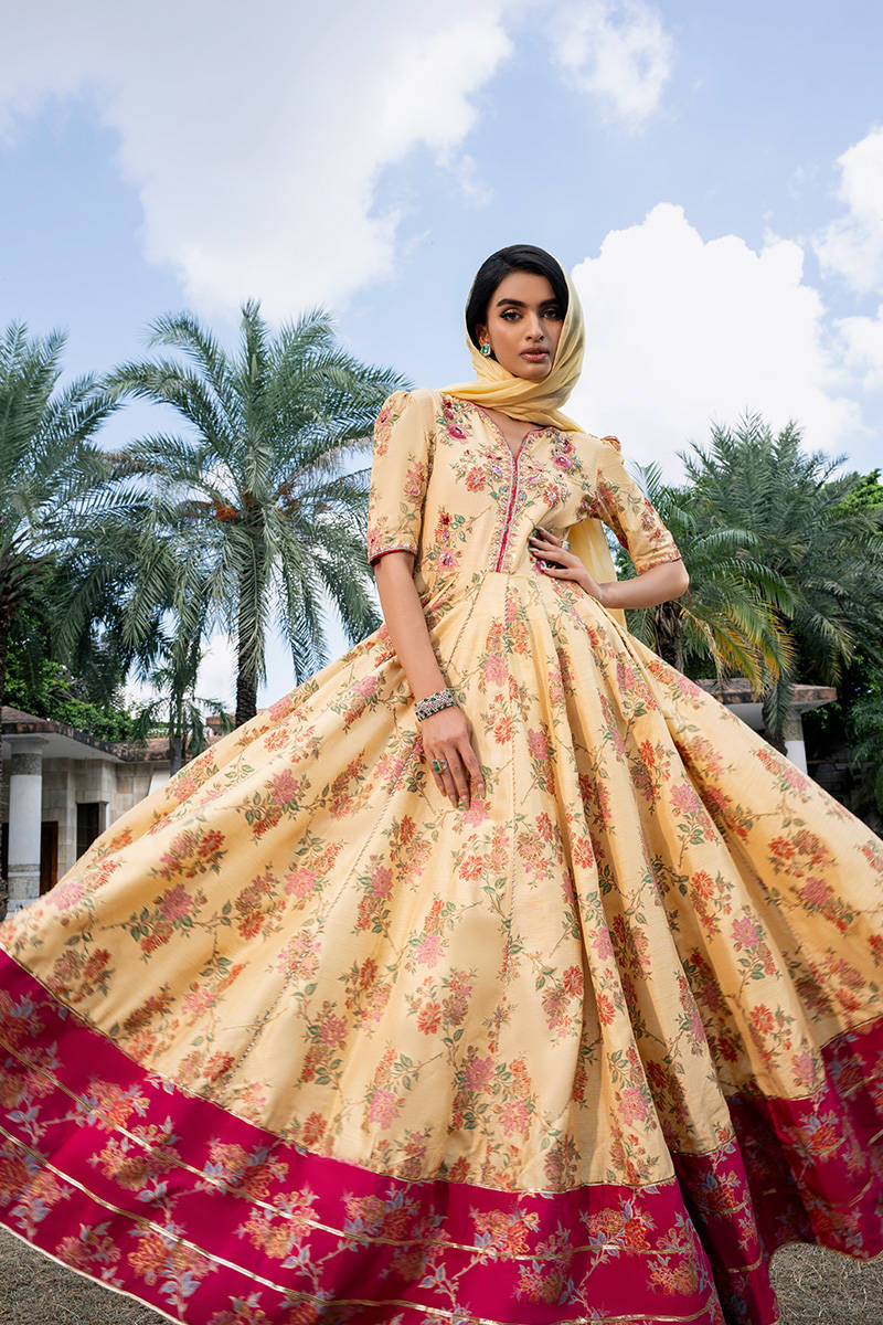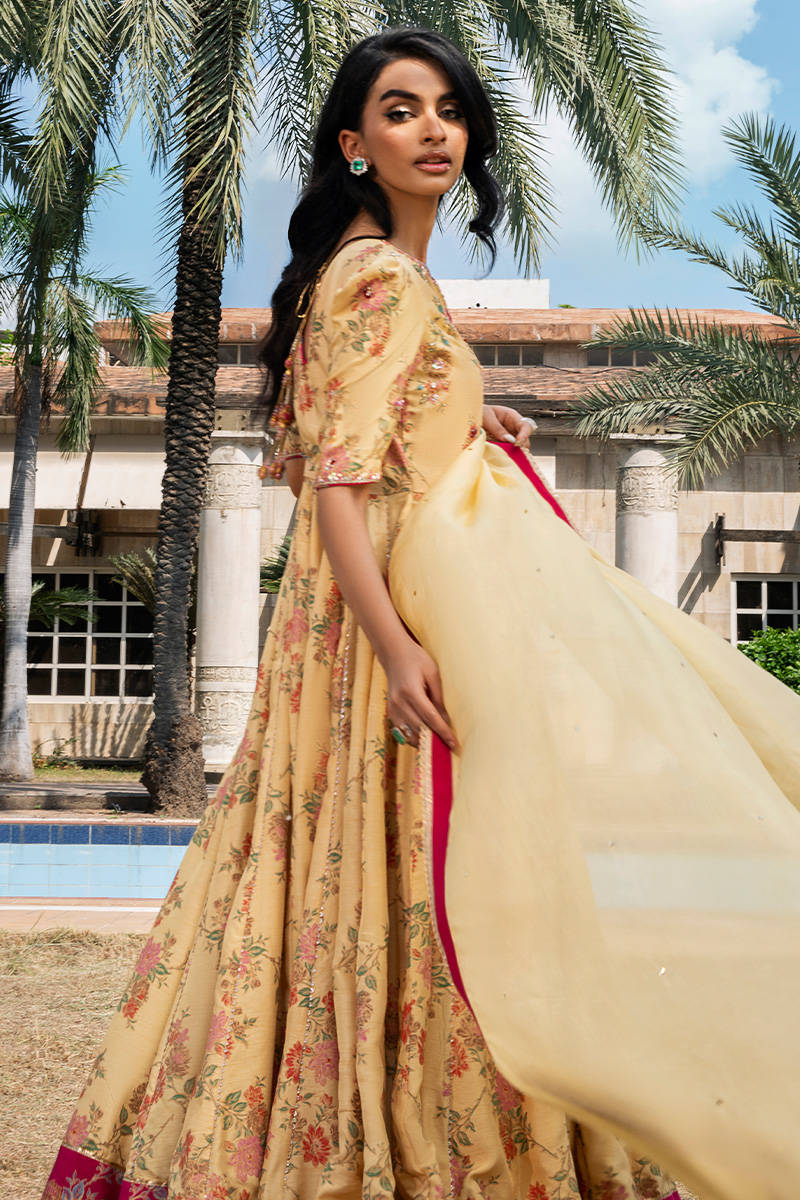 Butter Bloom is an ethereal Zainab Salman classic—crafted in screen-printed raw silk in a graceful kalidar silhouette. The design features an intricately hand-embellished bodice, paired with sophisticated Indian-style sleeves and contrasting pink printed borders that add a soft, feminine charm. The look can be completed with straight pants in a matching hue and a luxurious silk dupatta, making it a perfect blend of timeless elegance and contemporary grace.