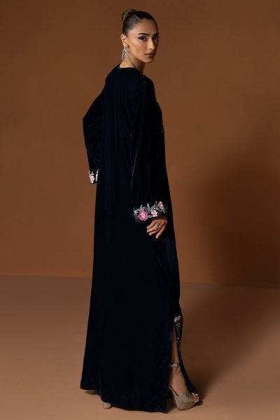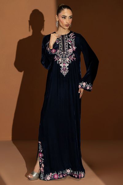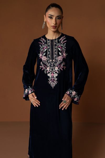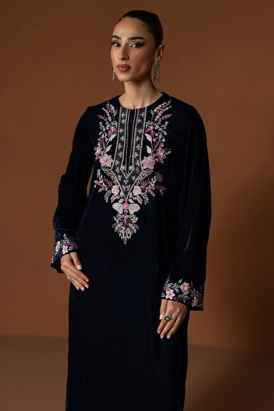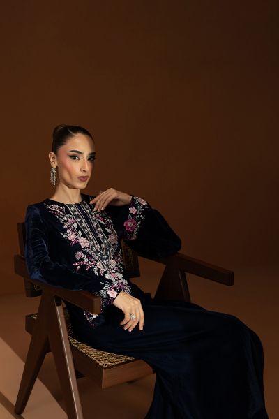 Celise captures the true spirit of Velvet season elegance in an enchanting navy blue hue. The straight velvet shirt is adorned with intricate detailing along the neckline and cuffs, showcasing refined craftsmanship and subtle artistry. Paired with sleek straight pants, this outfit embodies a balance of poise and sophistication, a timeless look that radiates grace and effortless charm, perfect for elevating your festive evenings.