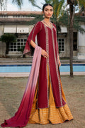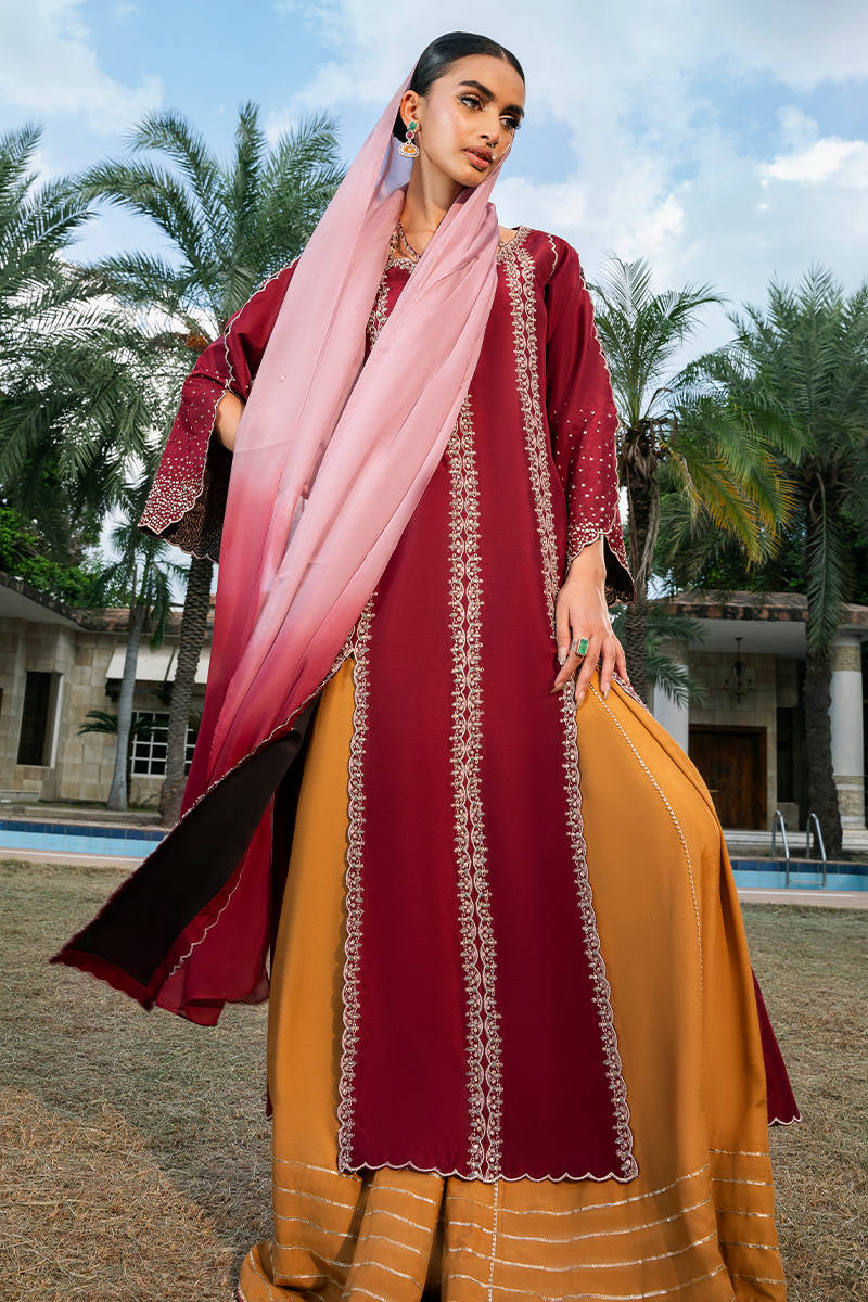 Cherry Muse is crafted from pure raw silk, featuring delicately embroidered panels adorned with intricate hand embellishments. The neckline is enhanced with detailed embellishments, while the sleeves make a statement with dramatic handwork and scalloped edges finished with shimmering sequins. Paired with contrasting mustard, extra-flared pants finished with gota detailing, the look exudes modern elegance. The outfit is completed with a stunning ombré silk scarf, adding the perfect feminine touch to elevate the ensemble.