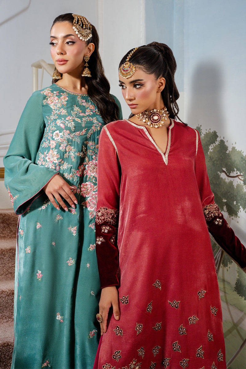 Cherry Wine is a striking dual-toned full-length shirt adorned with intricate embellishments, embroidery, and delicate gota detailing. Paired with flared pants that add a touch of contemporary charm, this ensemble perfectly balances modern elegance with traditional allure. Complete the look with a maroon dupatta for a sophisticated, festive finish.
