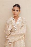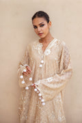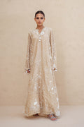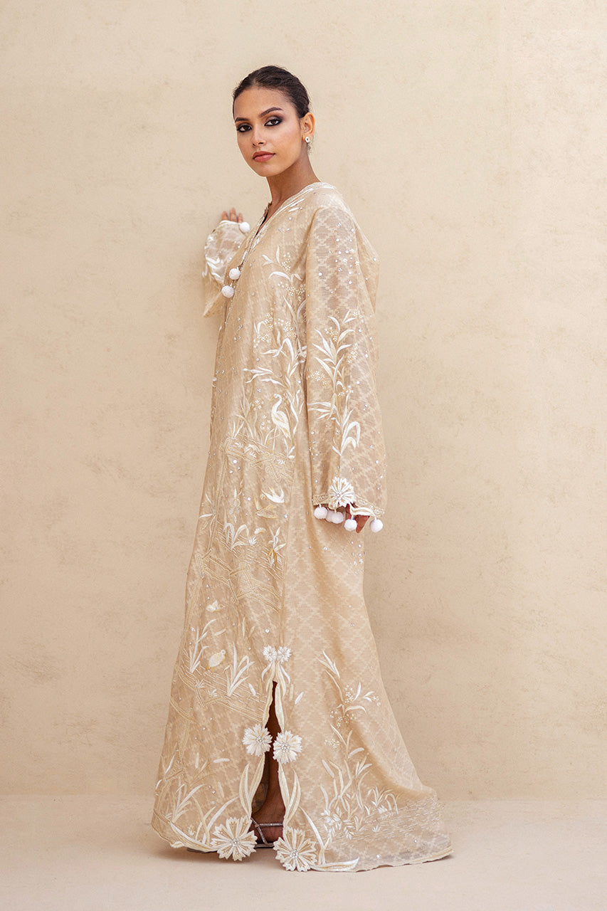 Bathed in a muted sand hue, a kaftan in self embossed cotton net is adorned with ivory resham embroidery, delicate botanicals unfolding across its length, glimmering with subtle sequins. The neckline and side slits bloom with floral resham cutwork while tasseled pompoms accent the cuffs and placket, adding a touch of whimsy.