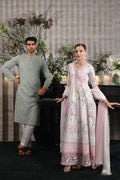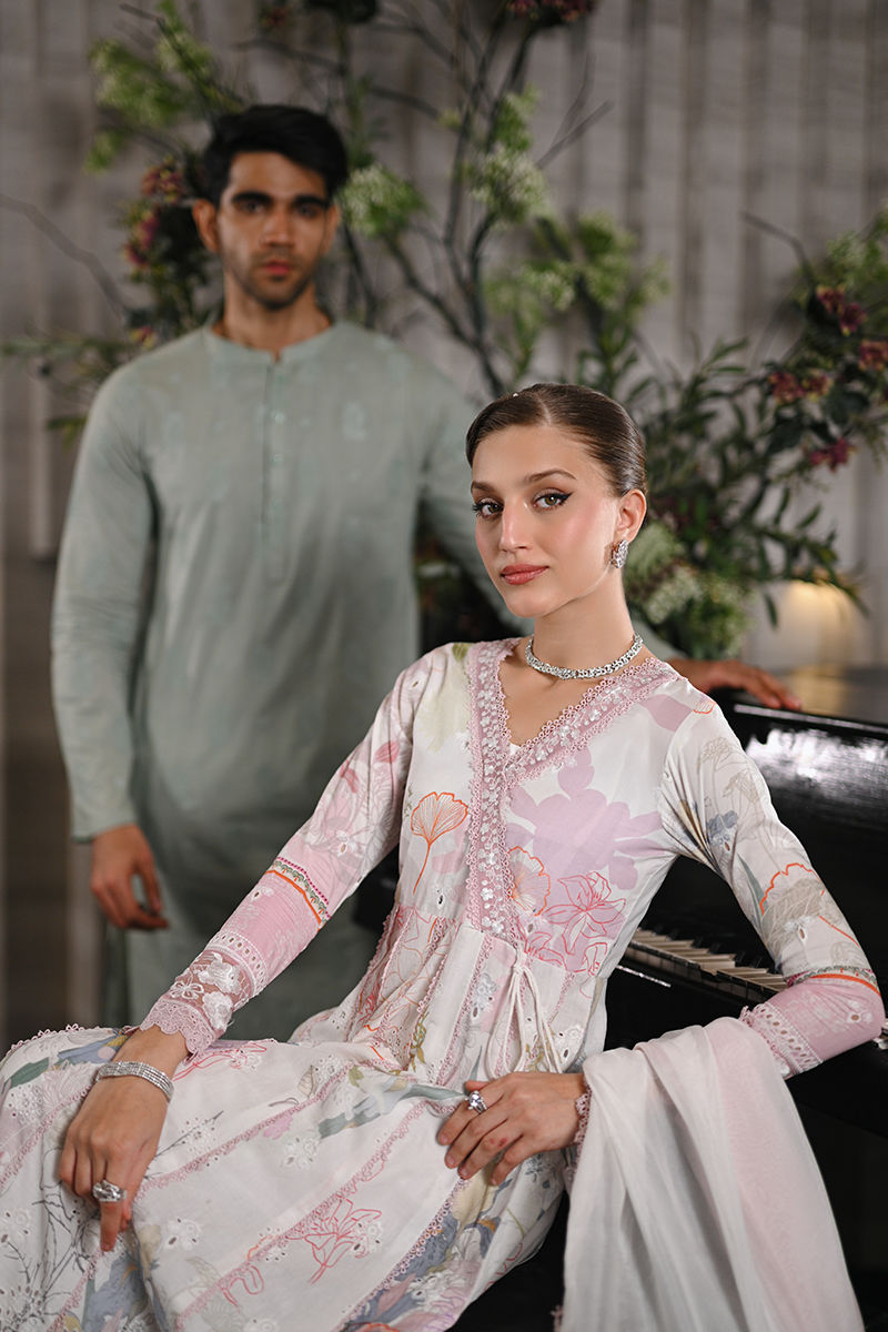 A stunning white Kalidaar, adorned with printed florals in soft pinks and blues, and embellished with graceful pink lace and embroidered organza borders. Paired with a luxurious silk dupatta, this ensemble exudes effortless elegance.