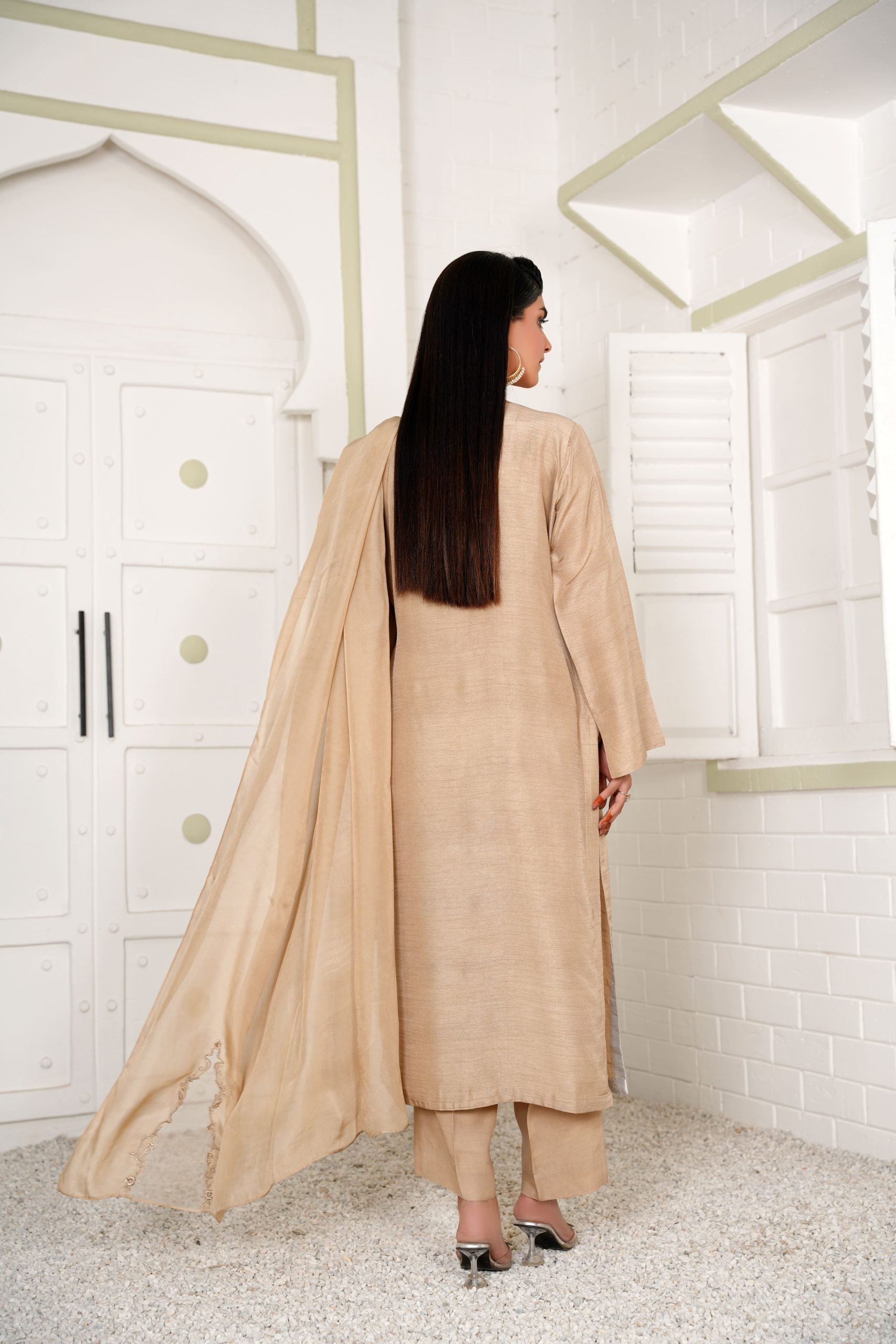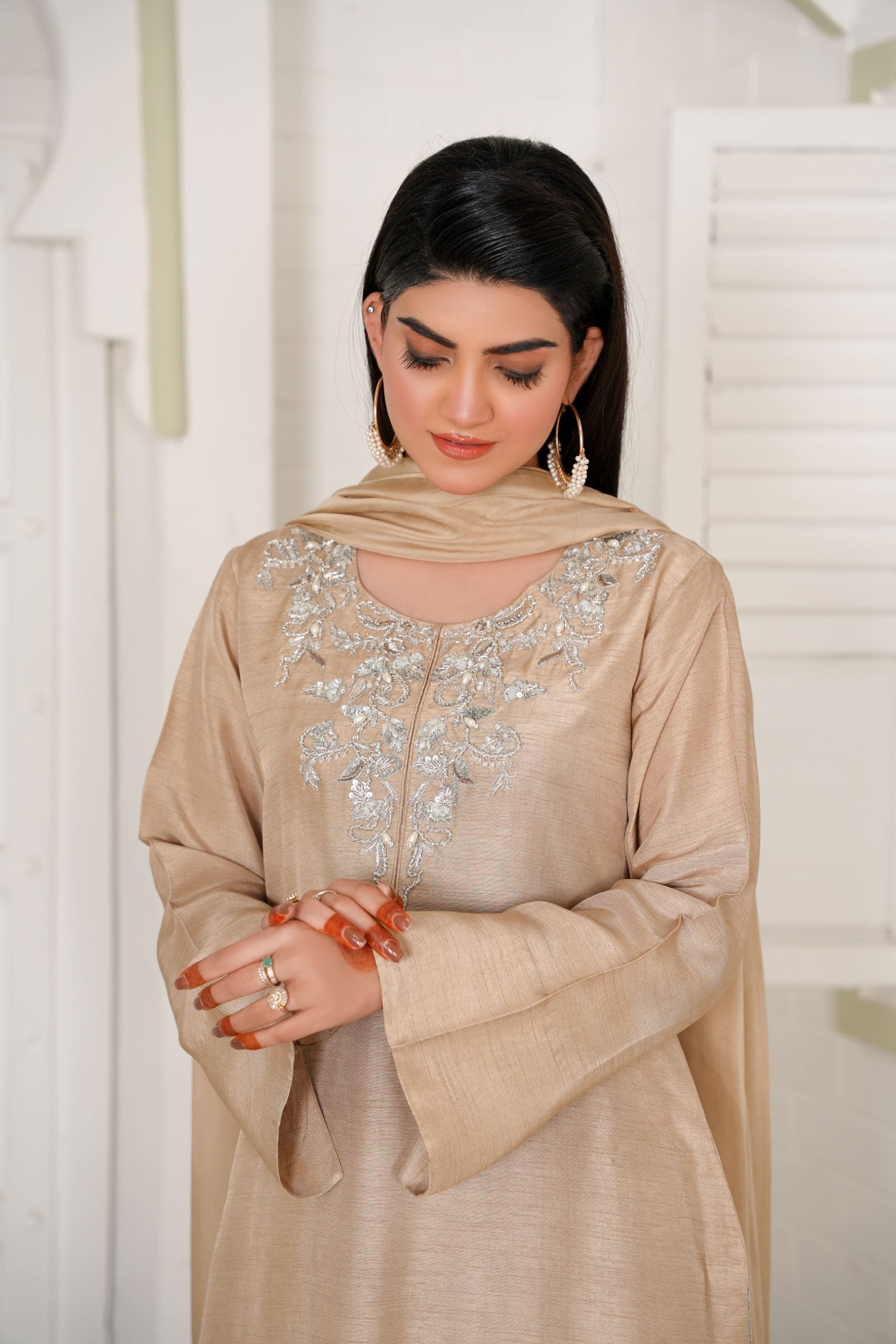 Elevate your with this beautifully crafted with intricate details using nakshi, dabka and pearls. Paired with silk dupatta and trousers.