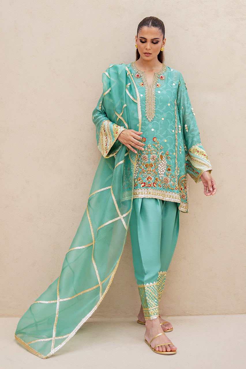 A serene turquoise ensemble shimmering with artisanal finesse. A cotton net short, cut in a timeless straight silhouette, is lavishly embroidered with zardoze, gota, resham and sequins in floral bursts and statement peacocks with diamante encrusted tails. Paired with tailored pure raw silk shalwar featuring intricate gota detailing. The matching airy organza dupatta, adorned with diagonal gota lines and delicate edging, drapes like a whisper of regality.
